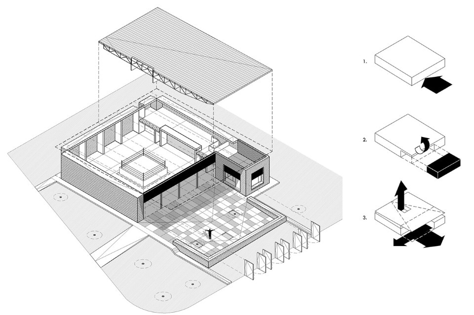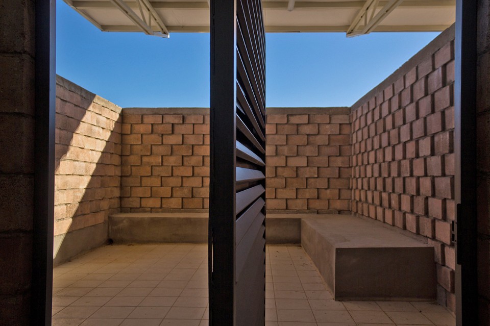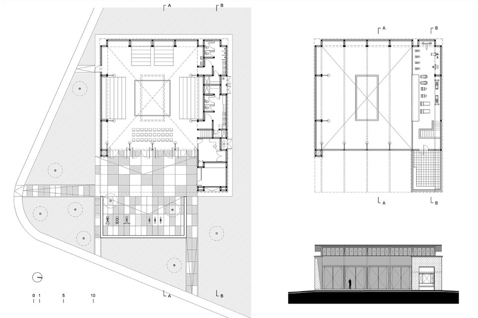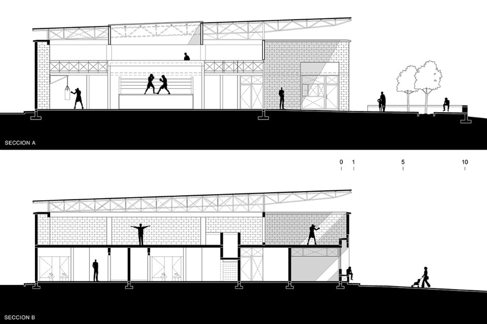 Una strategia supplementare mira a sviluppare un programma complementare: una piazza che rende ancora più pubblico il luogo. Inoltre, al progetto si aggiunge un piccolo spazio di vendita per sostenere economicamente gli istruttori che operano come volontari in palestra. La piazza, ampia circa duecento metri quadrati, è protetta da una struttura a sbalzo che fornisce ombra e estende l’uso di questo spazio anche quando la palestra è chiusa. La piazza funziona anche come estensione dello spazio interno quando le porte – quattro aperture di 3,8 per 3,8 metri – sono aperte. Pannelli traslucidi superiori e la luce proveniente dall’alto sottolineano l’area del ring, rievocando le vecchie tensostrutture adibite a questo sport. Al secondo livello, un’area pesi e una terrazza per la formazione privata completano il programma architettonico.