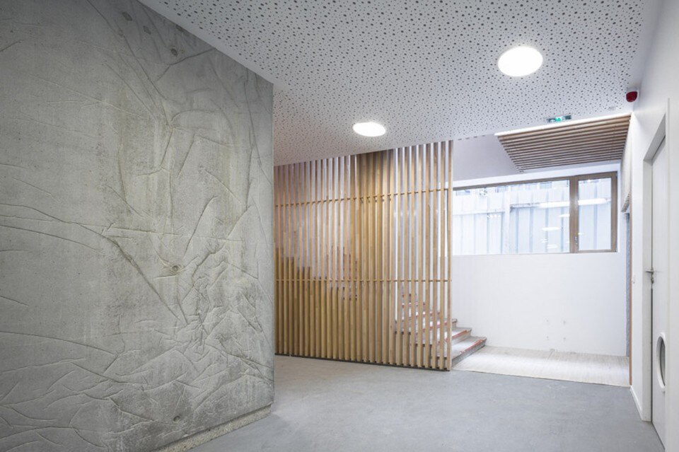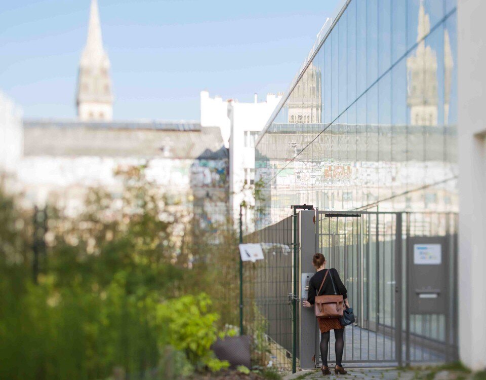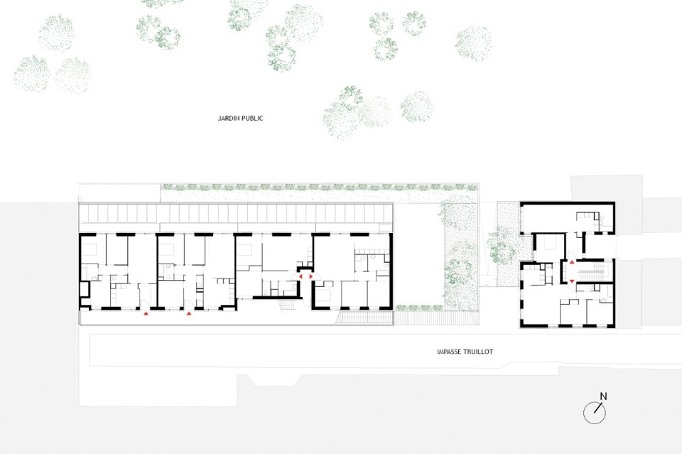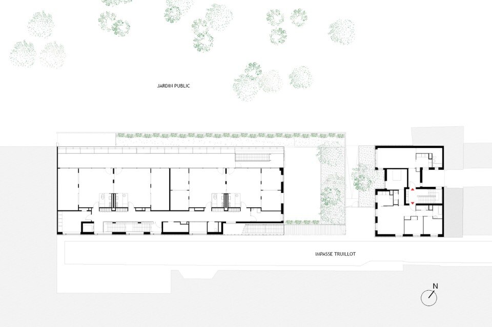 Il cul-de-sac diventa un passaggio: dalla strada al parco e dalla pietra al verde attraverso un passaggio alberato che mette in mostra la larghezza dell’edificio; e dal collettivo al privato attraverso un sistema di balconi affacciati sul cul-de-sac che servono gli appartamenti conducendo dal livello della strada al piano superiore. In tutte i modi la costruzione segnerà la frontiera tra città affollata e caotica e la città rilassante. L’obiettivo che sottende il progetto di Gaëtan Penhuel è rivelato da questa capacità di parlare a due mondi contemporaneamente.