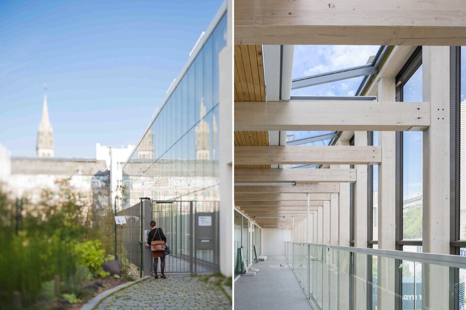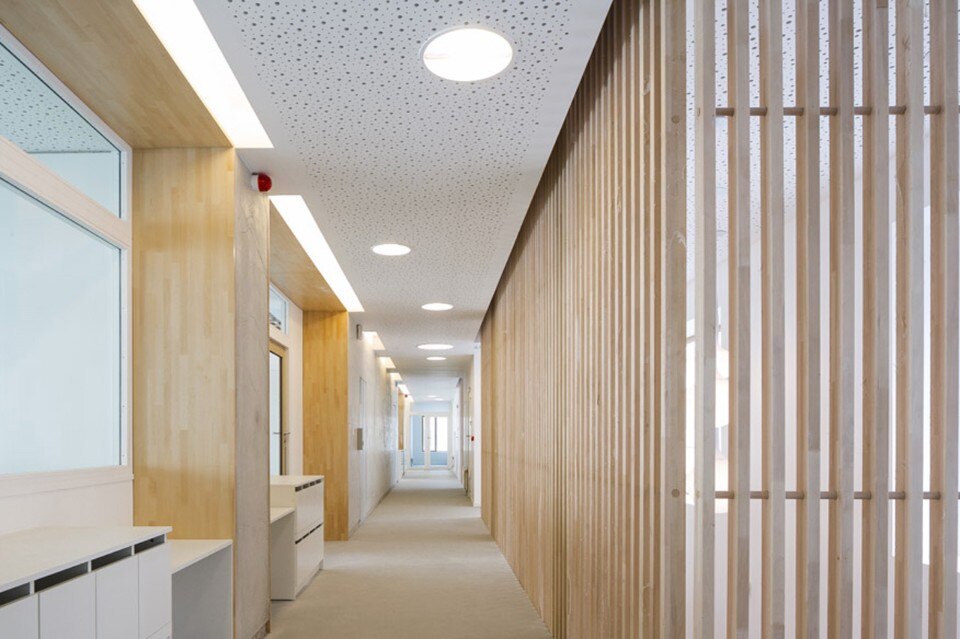 Per sfruttare al meglio la vista, le sale giochi della scuola materna e le zone giorno degli appartamenti dispongono di grandi finestre affacciate sul parco a nord. Allo stesso tempo, gli appartamenti si sviluppano longitudinalmente, offrendo uno spazio aperto dalla cucina, che dà sul cul-de-sac, al soggiorno, che si affaccia sul verde; in questo modo la luce del sud penetra in tutto lo spazio. Nell’asilo si crea un’area di gioco in più con un giardino d’inverno il cui doppio vetro funziona in estate e in inverno come cuscinetto termico, dando ai bambini una vista panoramica sul parco.