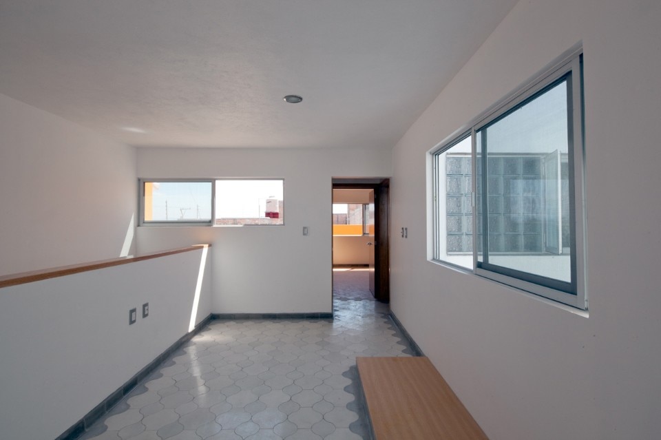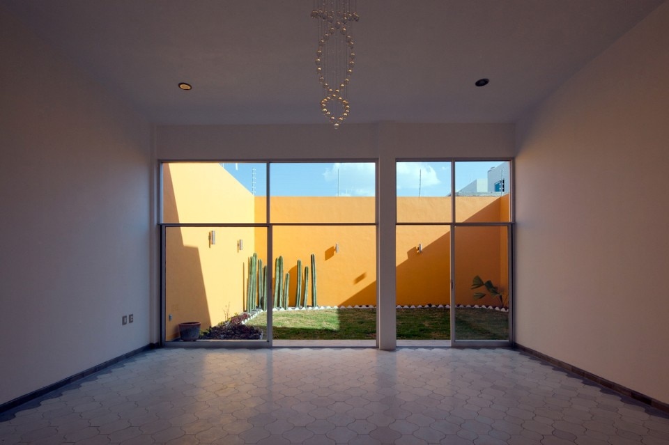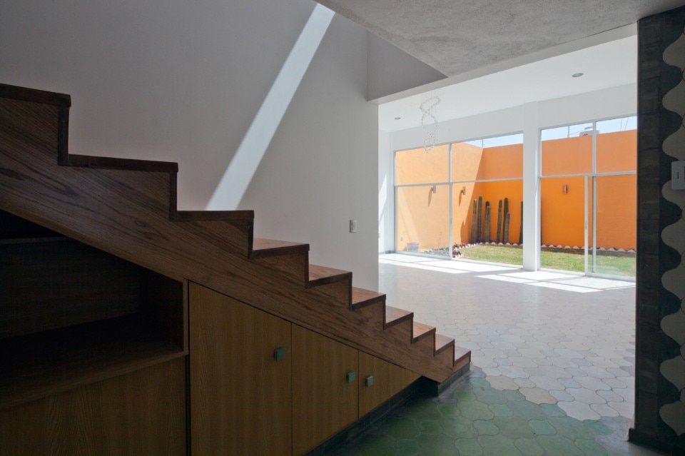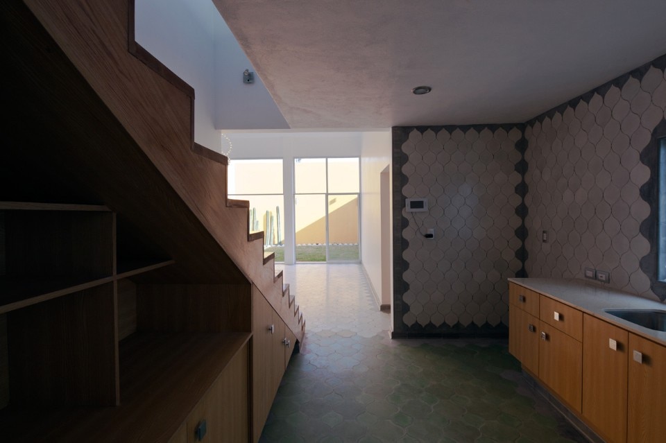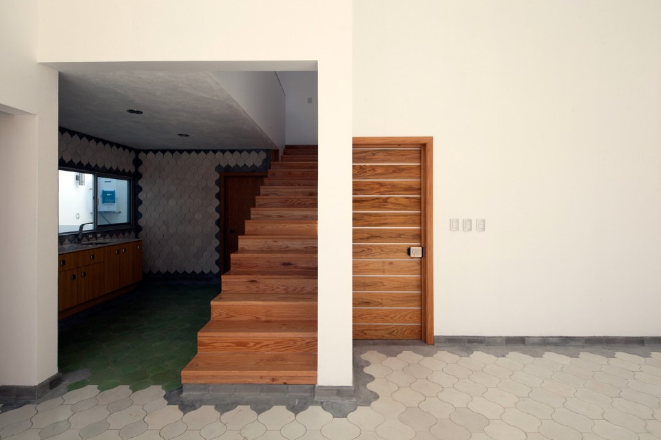 Il pavimento è rivestito con piastrelle fatte a mano tradizionali della città di Guadalajara, composte di cemento e pigmenti. La posa si adatta alla proporzione di ogni spazio allineando le piastrelle in modo che sembrino sfocarsi procedendo dal soggiorno verso il cortile di servizio.