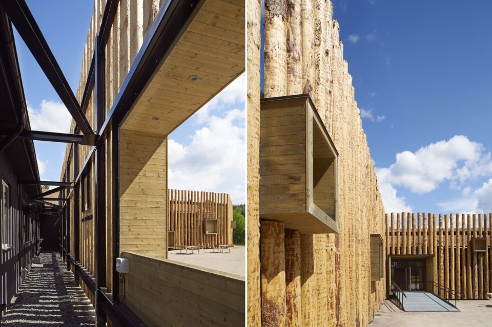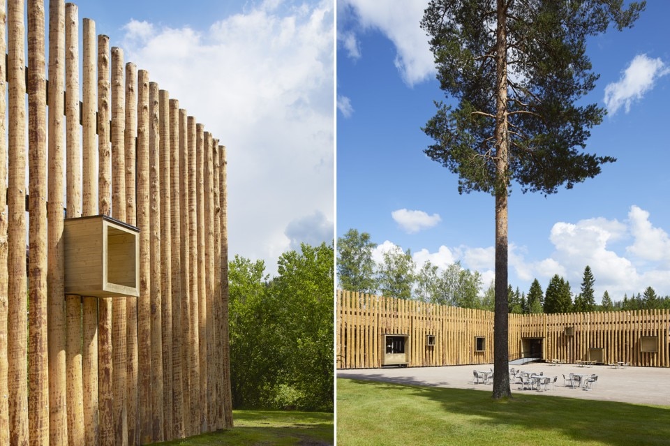 Bornstein Lyckefors Architects, Finnskogscenter Museum, Torsby, Svezia. Il legno e gli elementi aggettanti della facciata non sono trattati e invecchieranno simultaneamente