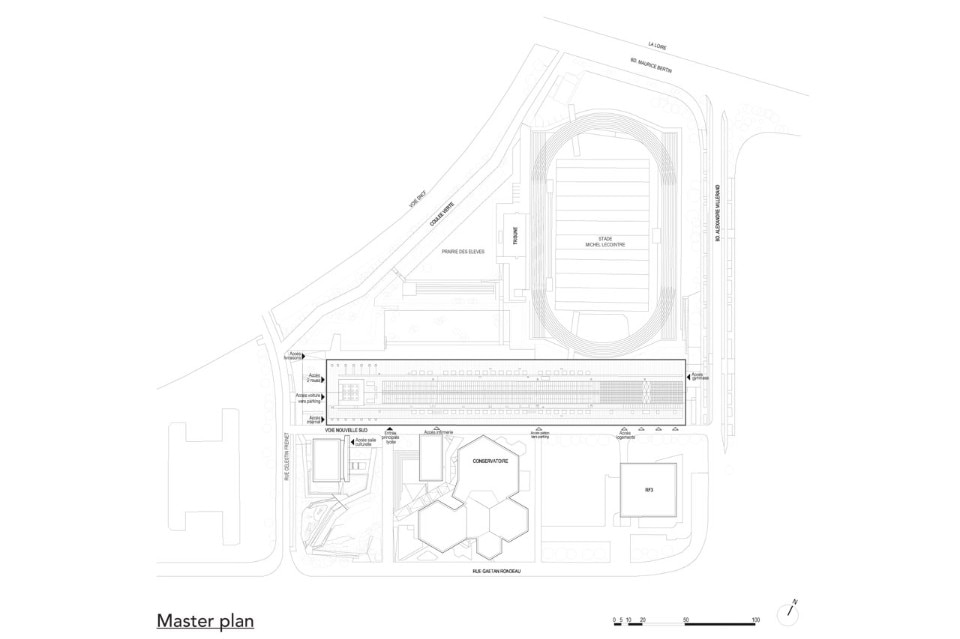Ci sono infatti tre edifici sotto il tetto di vetro che condividono le loro pareti fredde e la vista sul giardino d’inverno del centro di documentazione e sullo spazio all’aperto della caffetteria. Questo spazio bioclimatico è vivacizzato e dilatato da viste sulla Loira in lontananza. L’architettura si dissolve tra questi interni e il paesaggio urbano per evidenziare la razionalità dei percorsi e la chiarezza degli usi.