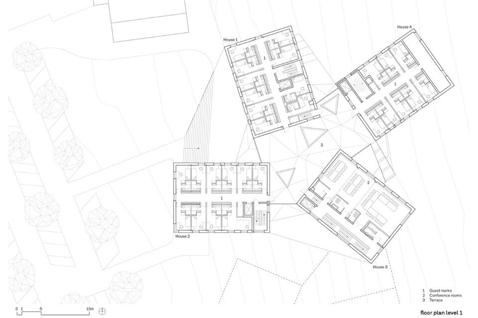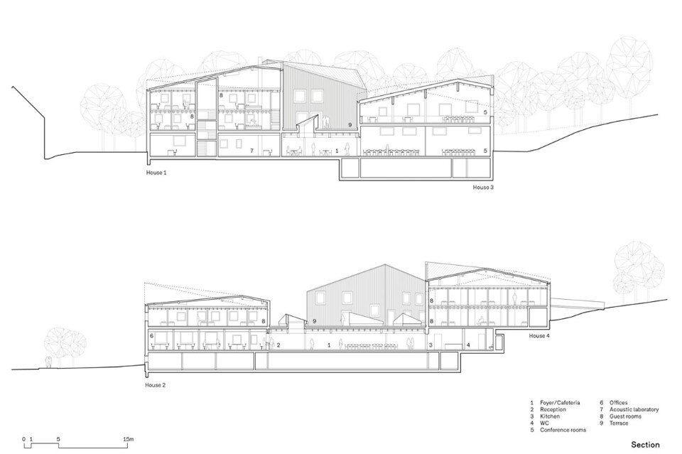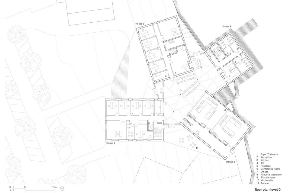 Intensificando la pendenza del prato l’insieme risulta integrato nel paesaggio pur rimanendo leggibile come un luogo di apprendimento, ricerca e scambio. I livelli più bassi ospitano usi attivi come i laboratori, gli uffici e le sale per conferenze mentre la parte superiore le residenze per i ricercatori.