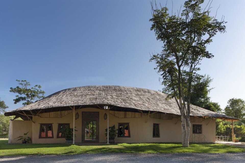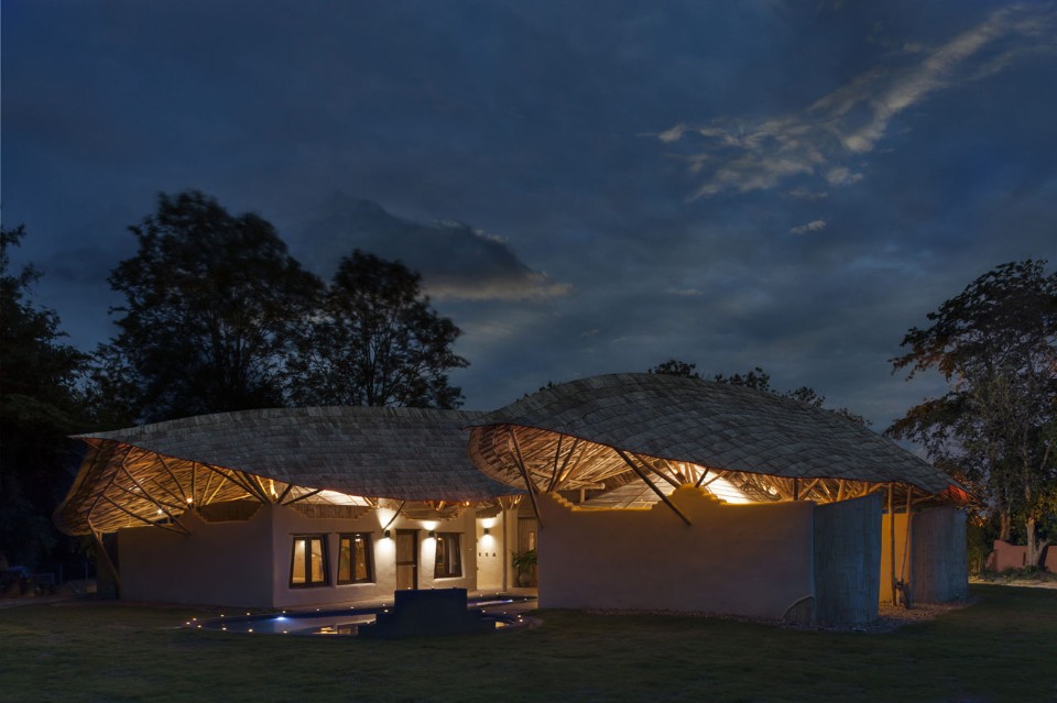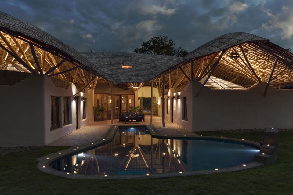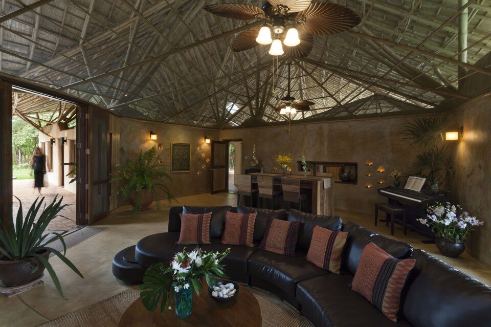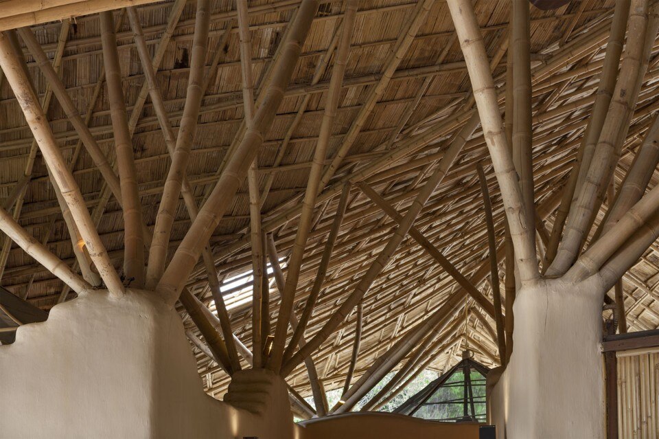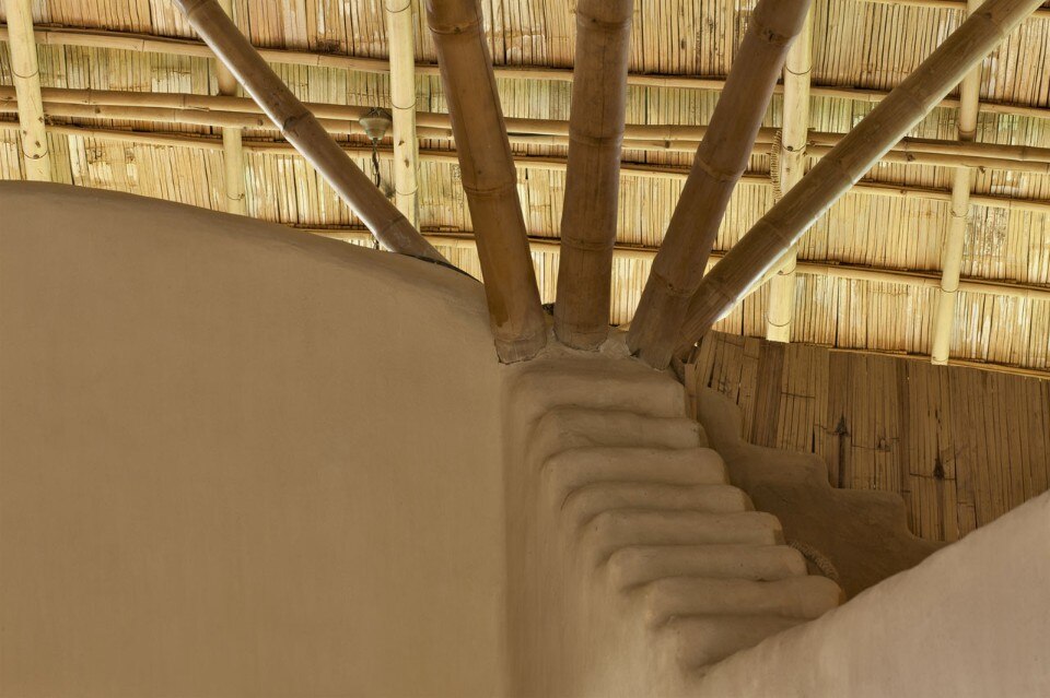 Un grande tetto di bambù copre l’intera costruzione come un ombrello, proteggendolo contro il sole e la pioggia senza chiudere gli ambienti, ma lasciandoli aperti alla ventilazione naturale e al rapporto con l’esterno. Le pareti sono fatte di mattoni di adobe con finitura in terra fine, il pavimento è in terra battuta composta da un mix di argilla e cemento. Una porta indiana dà all’intero progetto un tocco orientale.