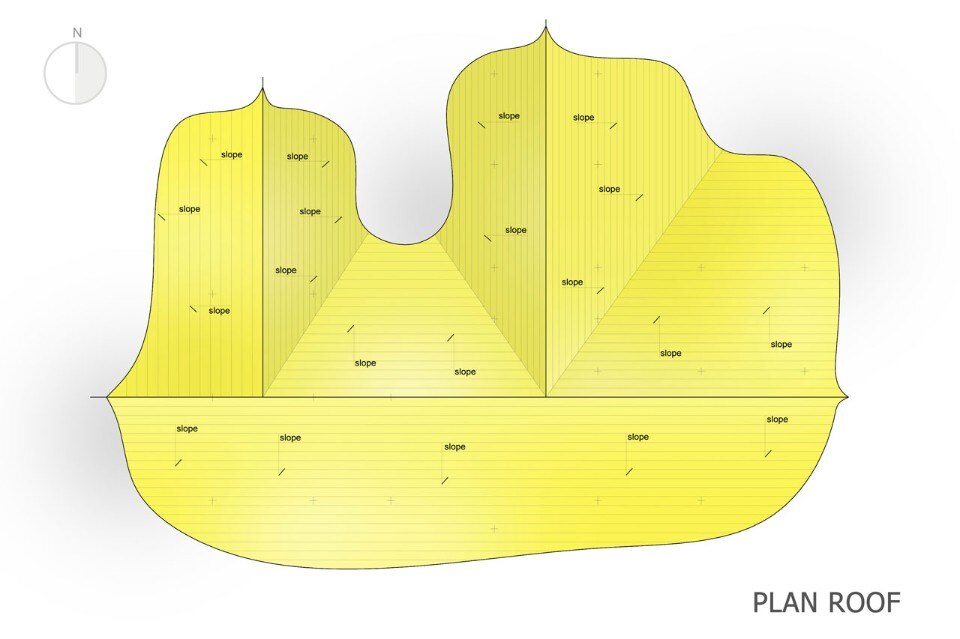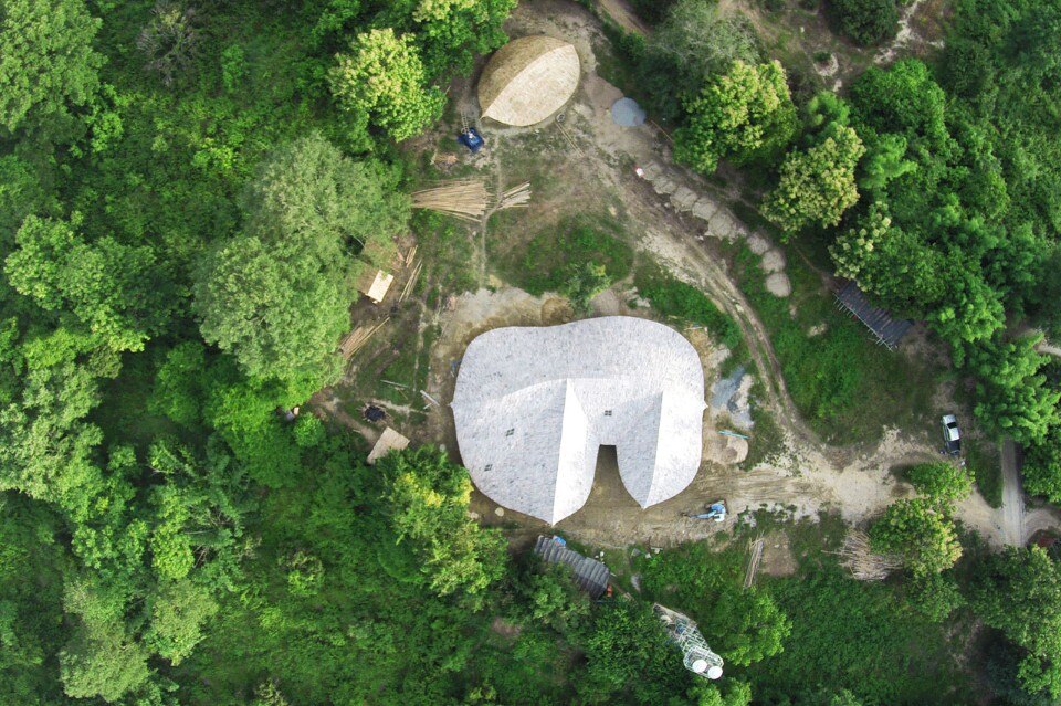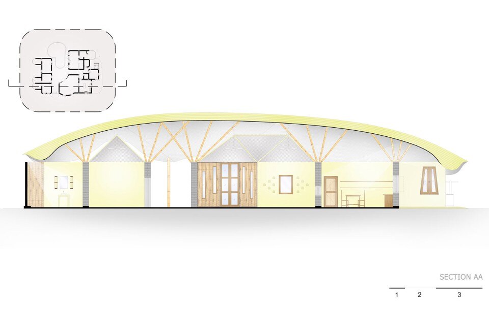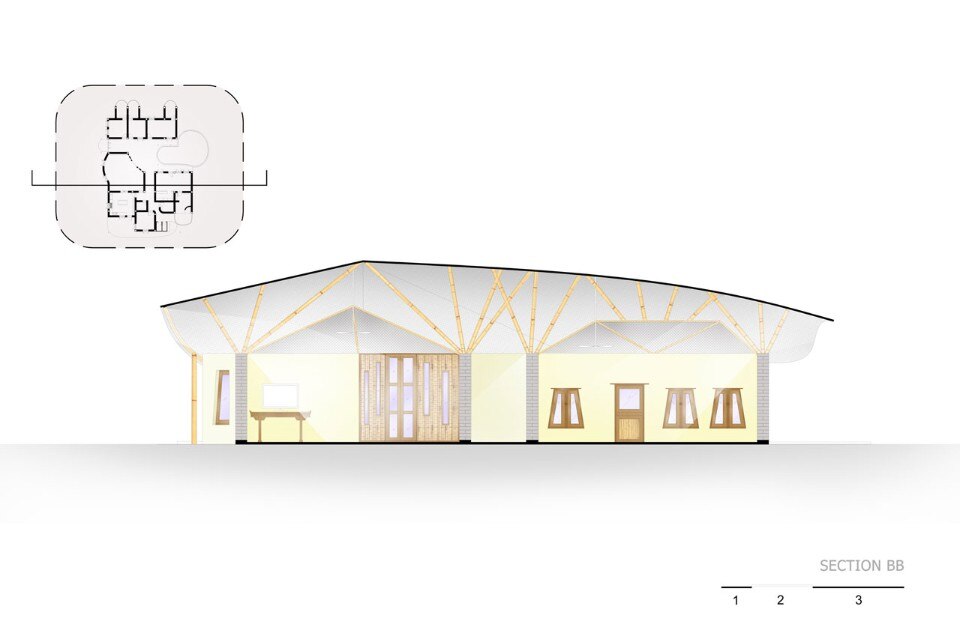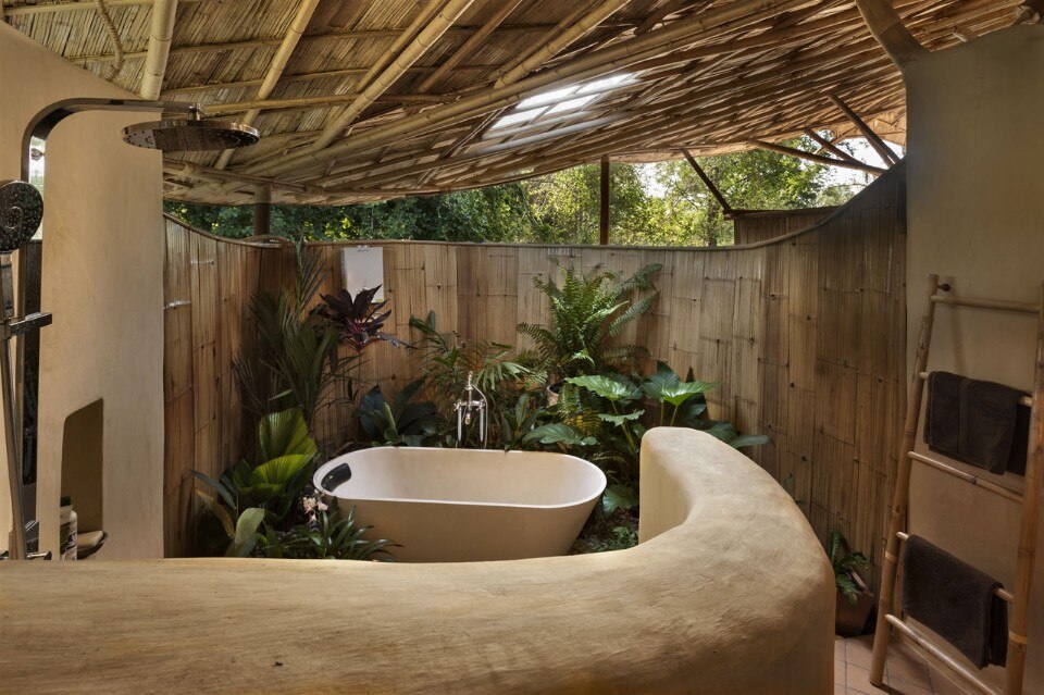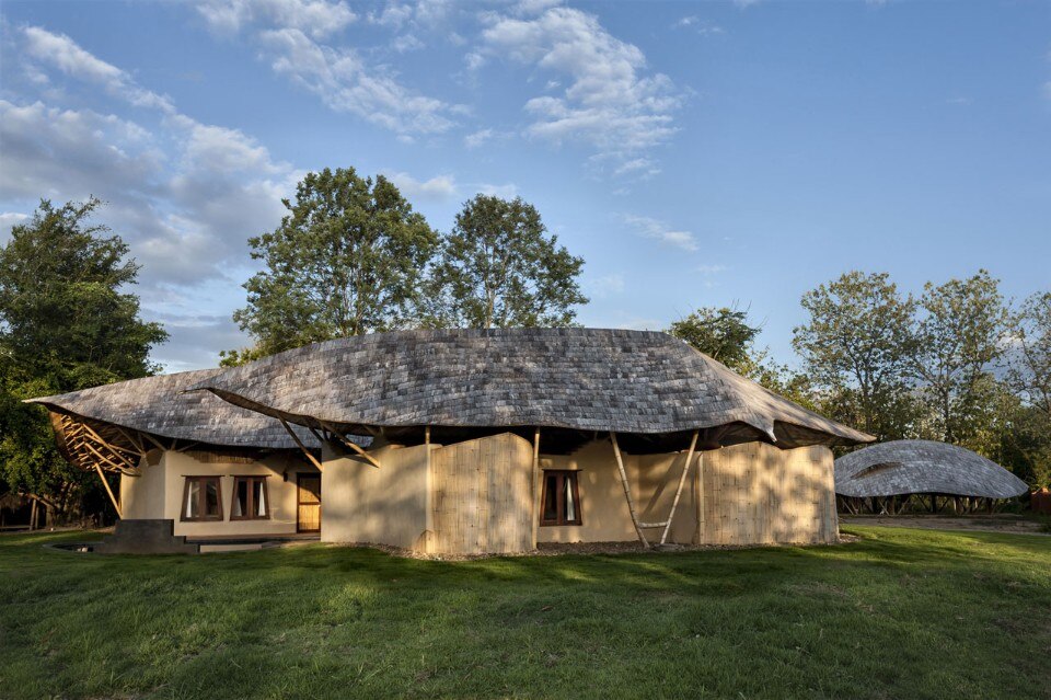 Un grande tetto di bambù copre l’intera costruzione come un ombrello, proteggendolo contro il sole e la pioggia senza chiudere gli ambienti, ma lasciandoli aperti alla ventilazione naturale e al rapporto con l’esterno. Le pareti sono fatte di mattoni di adobe con finitura in terra fine, il pavimento è in terra battuta composta da un mix di argilla e cemento. Una porta indiana dà all’intero progetto un tocco orientale.