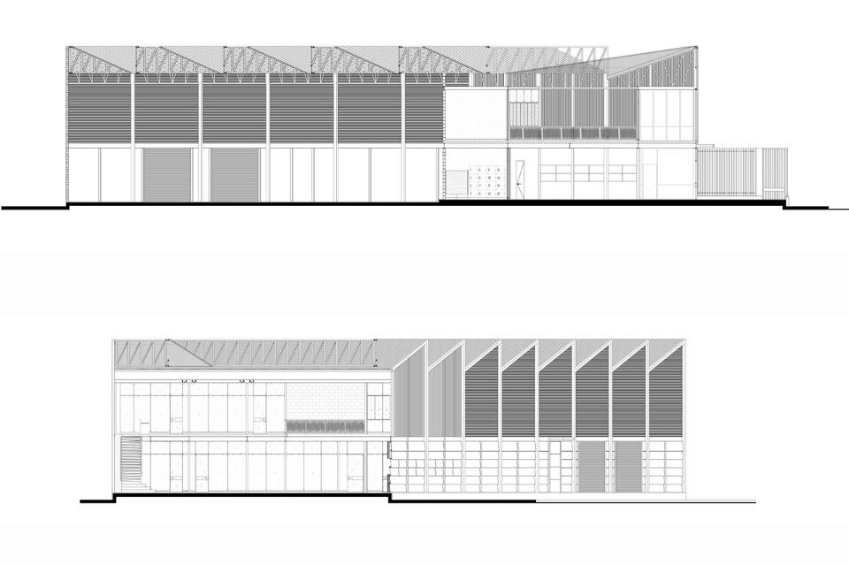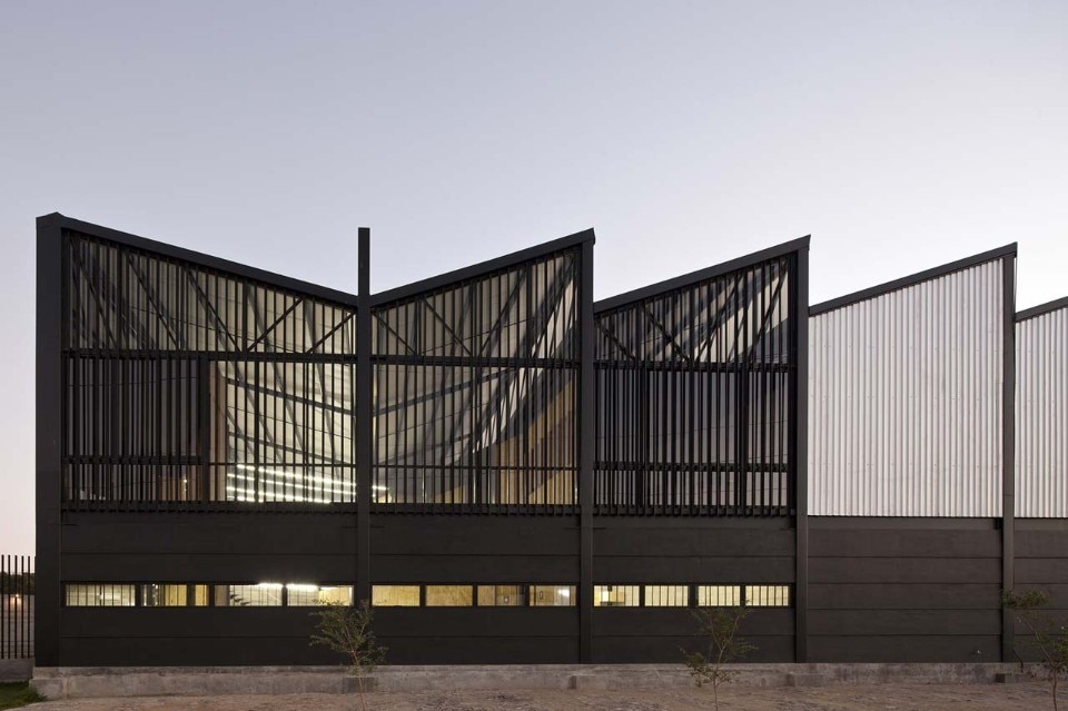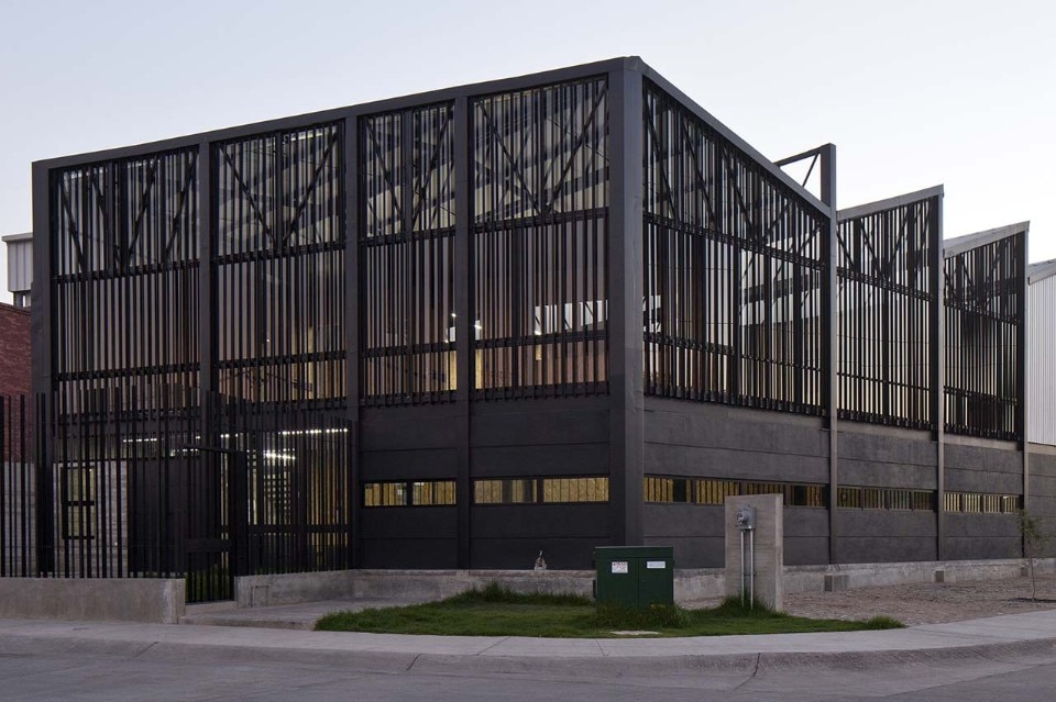 Un reticolo di aste in acciaio riduce la radiazione solare e protegge le finestre da possibili atti di vandalismo (il magazzino sorge in una zona poco frequentata durante la notte).