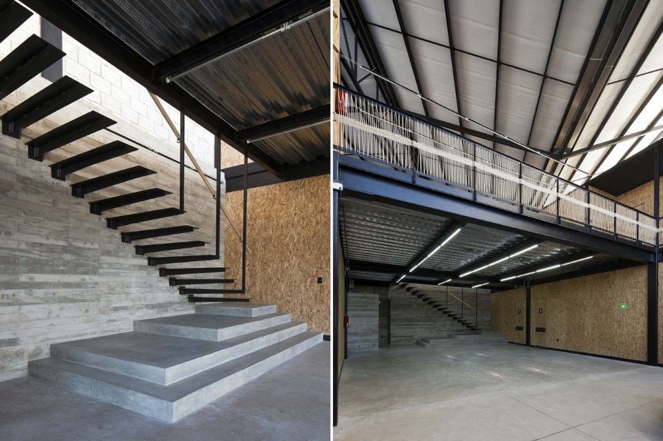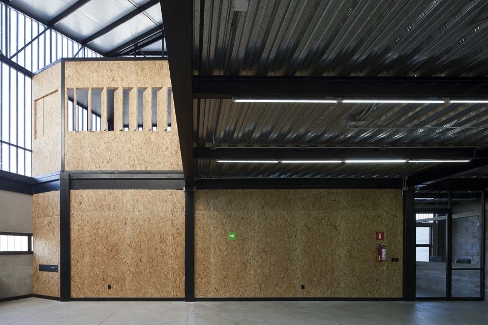 Lo spazio di lavoro interno è a doppia altezza, definito da pareti realizzate con pannelli di OSB, economici, informali e dal carattere industriale.