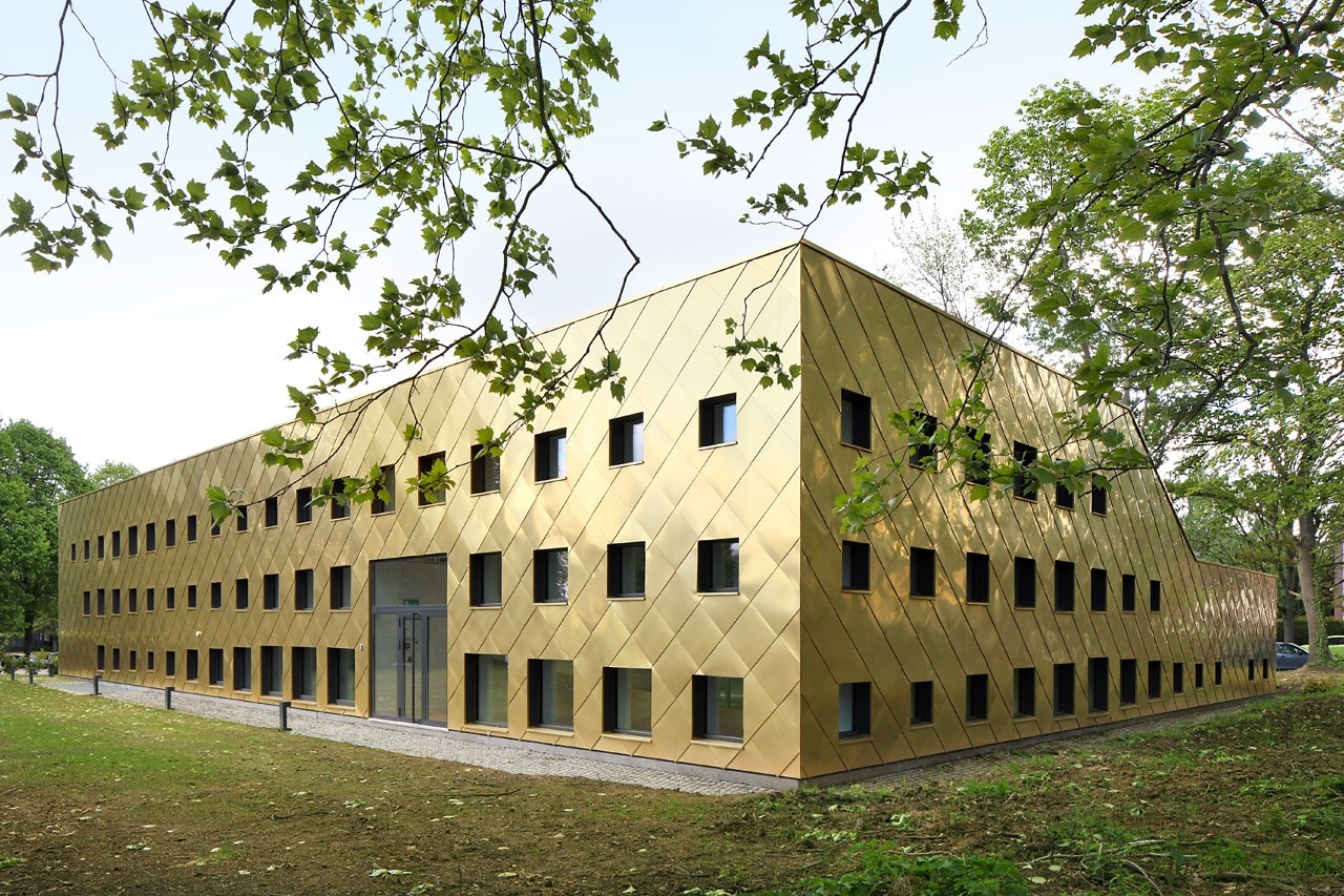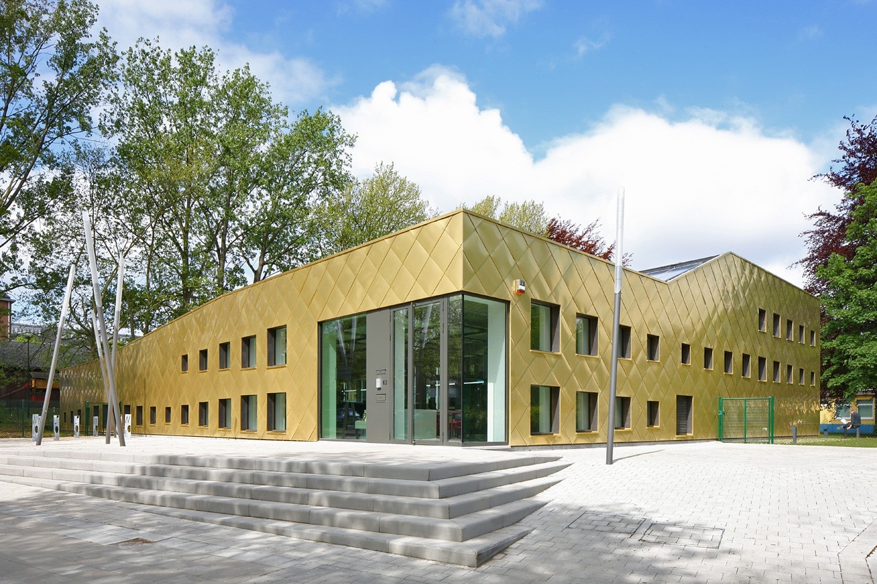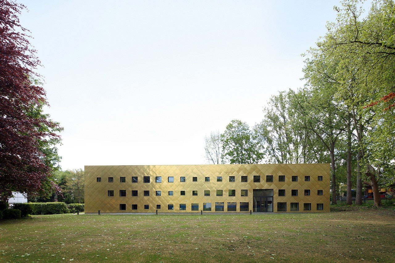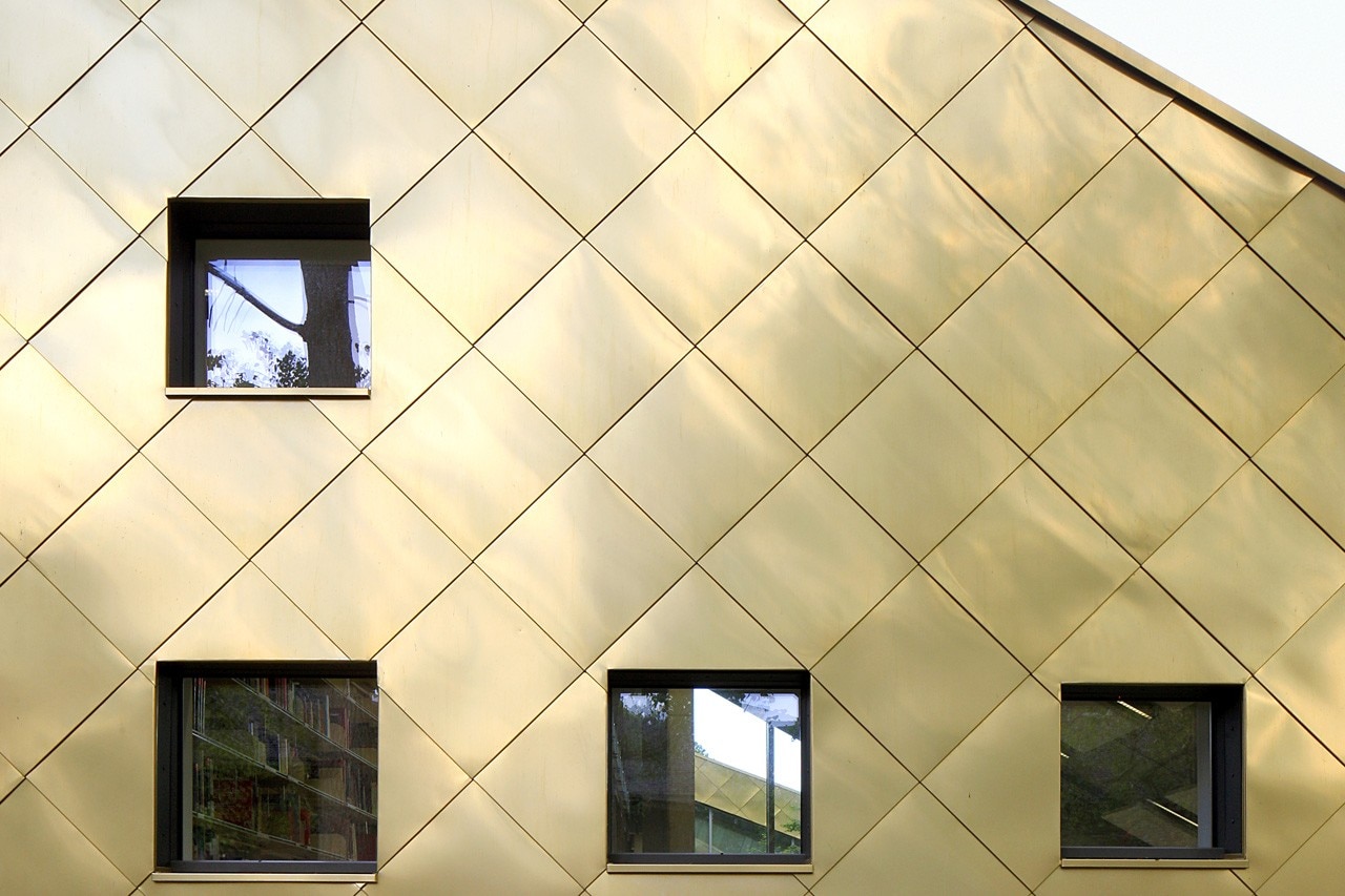 Come le lettere dorate negli scritti medievali conservati nella biblioteca, il volume è rivestito con pannelli metallici composti da una lega che differisce meno del 2% dai centesimi di euro. Il rivestimento di facciata è stato scelto per il suo modo di riflettere il contesto, in modo che si crei un prezioso bagliore d’oro su uno sfondo di verde lussureggiante. All’interno la sala principale è protetta da un prezioso soffitto in metallo progettato negli anni Sessanta da Jules Wabbes, recuperato dall’edificio della banca generale nel centro di Bruxelles.