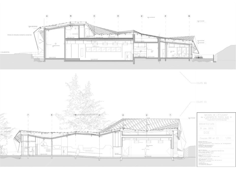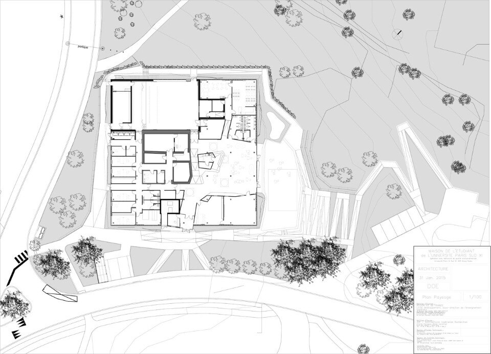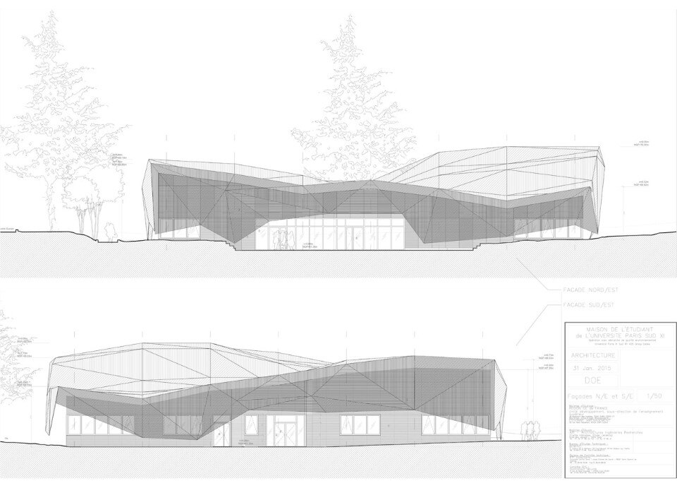 Per Air Architectures la Maison de l’Étudiant non è soltanto proiezione materiale dello spazio reale ma anche dello spazio figurato in quanto “gli scienziati utilizzano i frattali per ricreare la natura, essi vedono un albero come composizione geometrica del fogliame, una natura ricomposta”. La realizzazione presenta un principio geometrico strutturale chiaro dove l’impianto a griglia è punteggiato da veri tronchi d’albero utilizzati come supporti verticali.