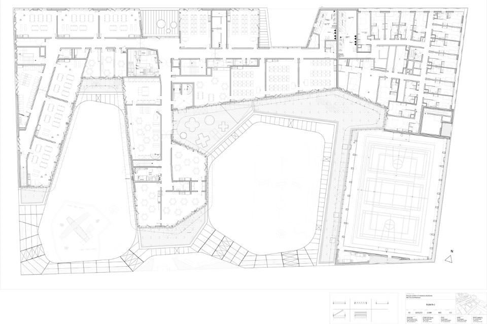 Il complesso scolastico è organizzato in tre “penisole”, che formano due campi da gioco verso sud, garantendo la massima illuminazione per le zone più utilizzate: aule, corridoi e campi da gioco. La scuola si presenta come un paesaggio di terrazze sfalsate e piantumate. I campi da gioco rivolti a sud sfruttano appieno il sole e il paesaggio.
