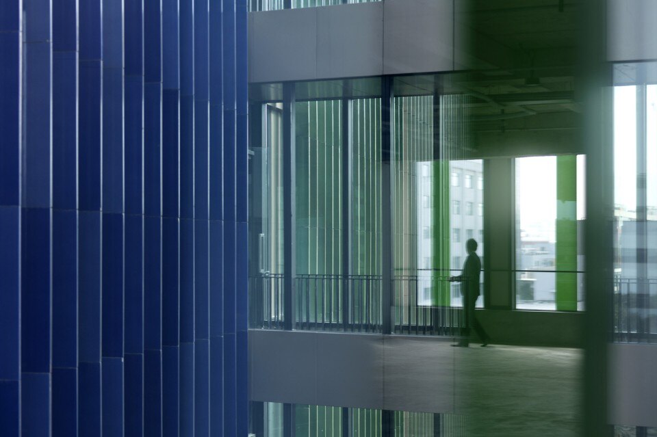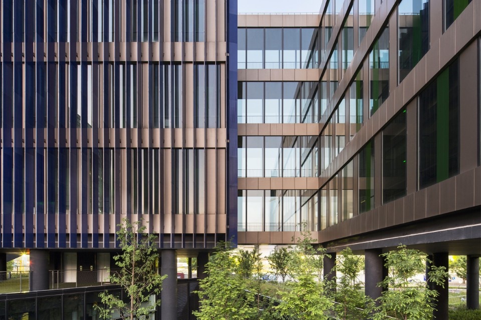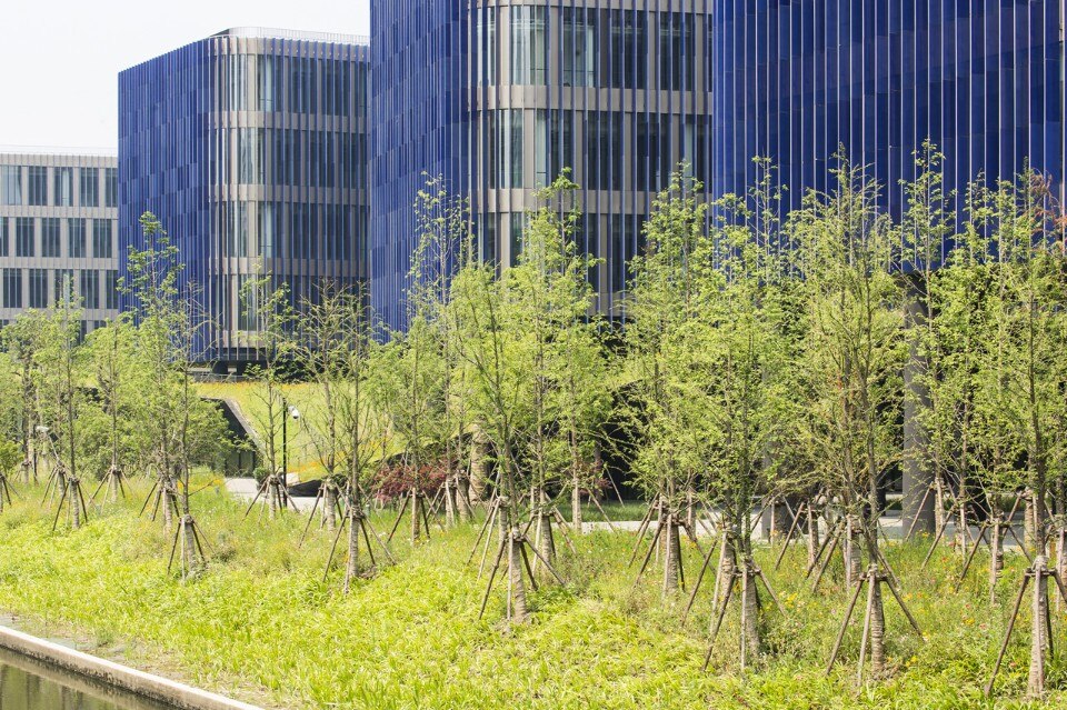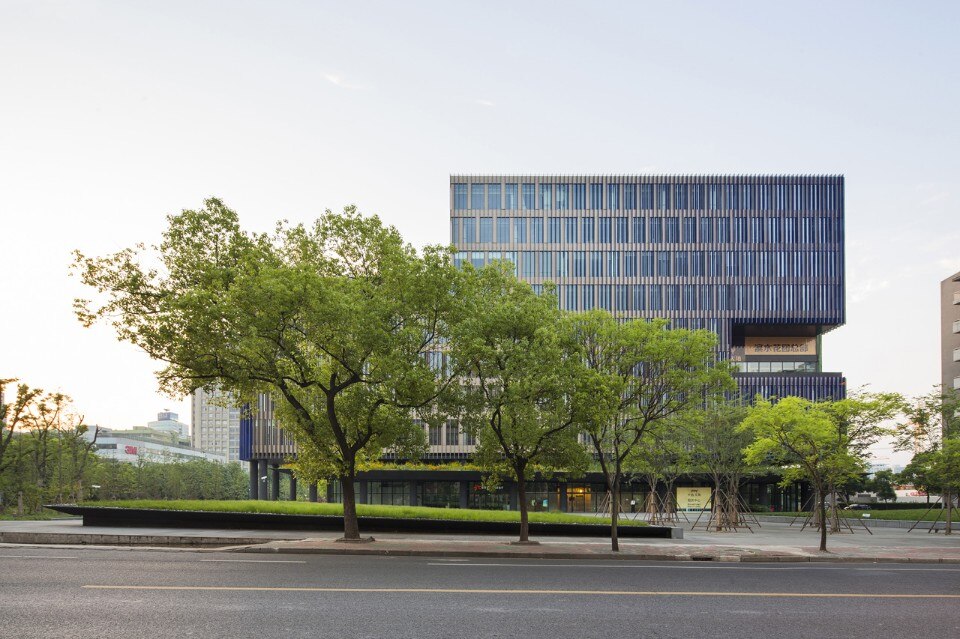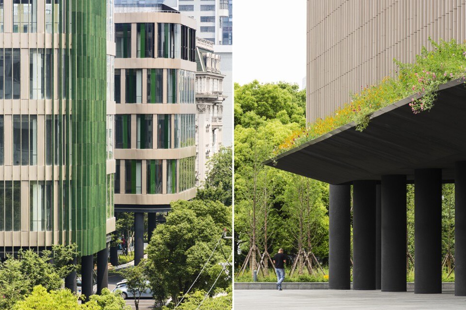 Le facciate sono rivestite di lame verticali che proteggono le strutture dal potente sole di Shanghai.