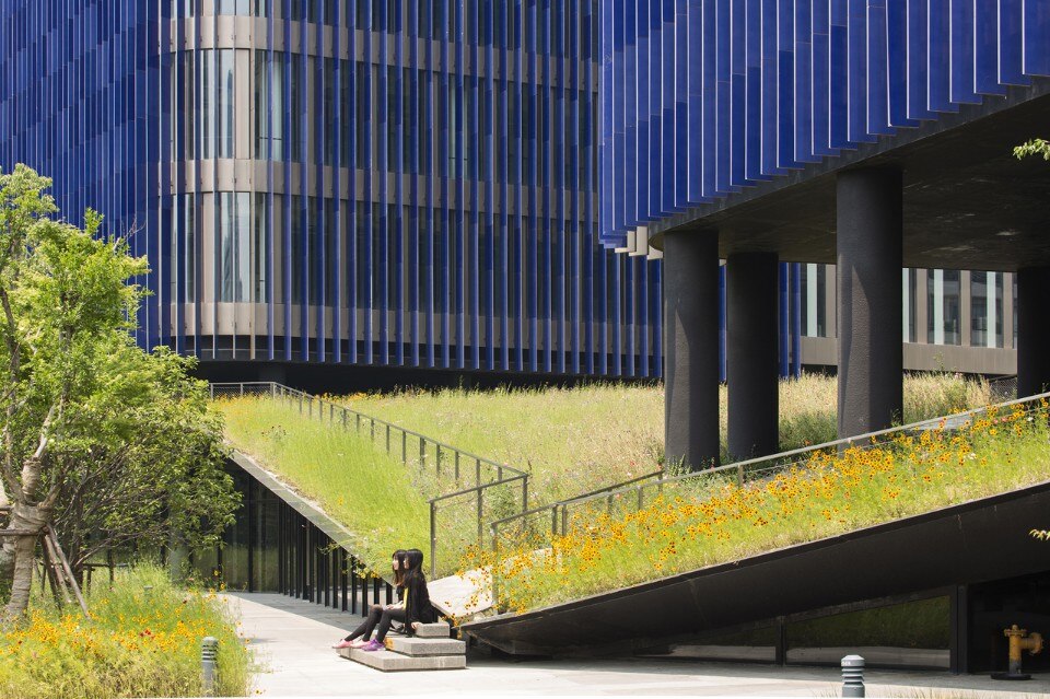 Anche il piano terra degli uffici è considerato come un paesaggio, un rilievo alberato con alcune parti rivolte verso il basso come un invito a correre su di esso. I residenti possono anche camminare lungo un percorso sul tetto del piano terra.