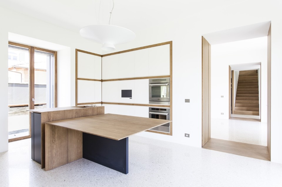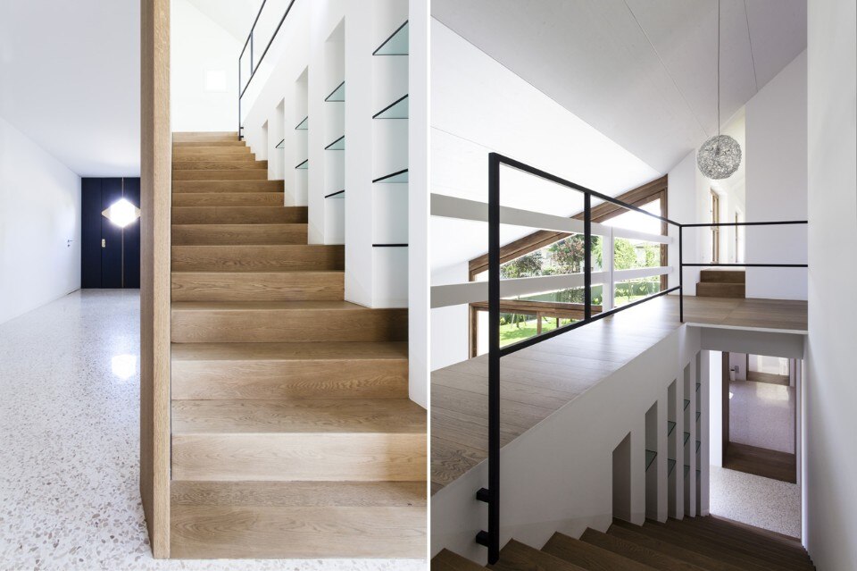 Negli spazi interni si alternano compressioni formate dalle soglie tra un locale e un altro, dilatazioni e doppie altezze.