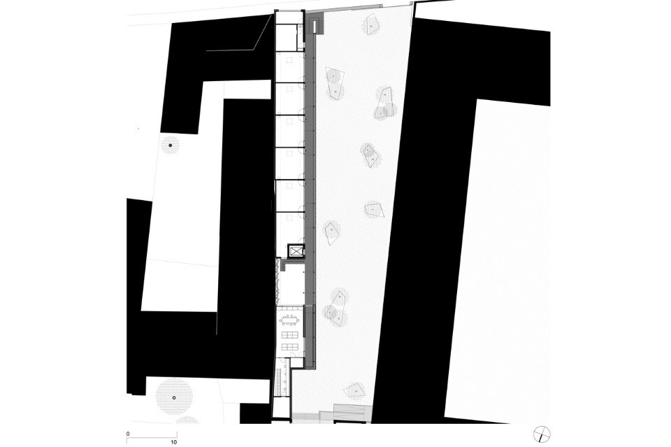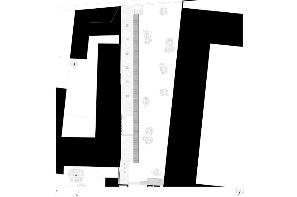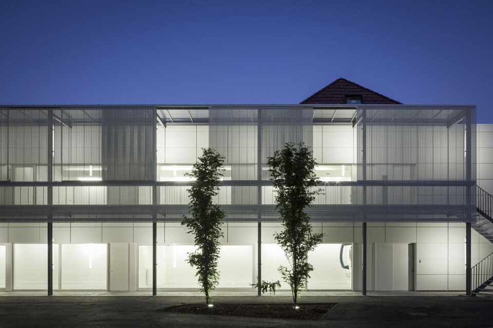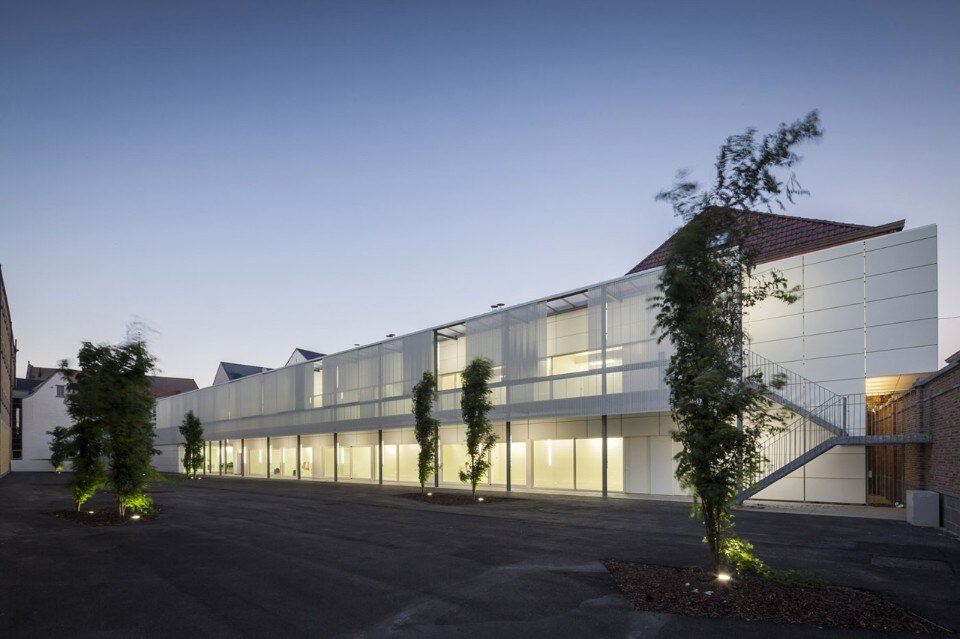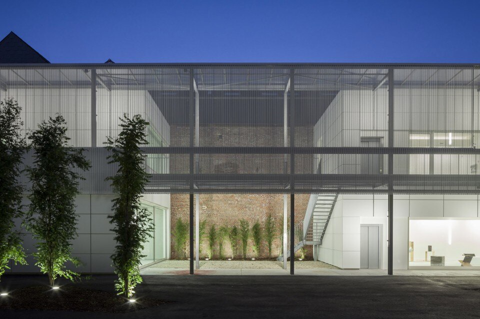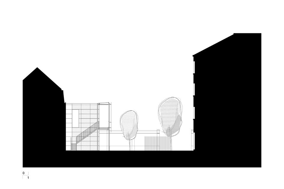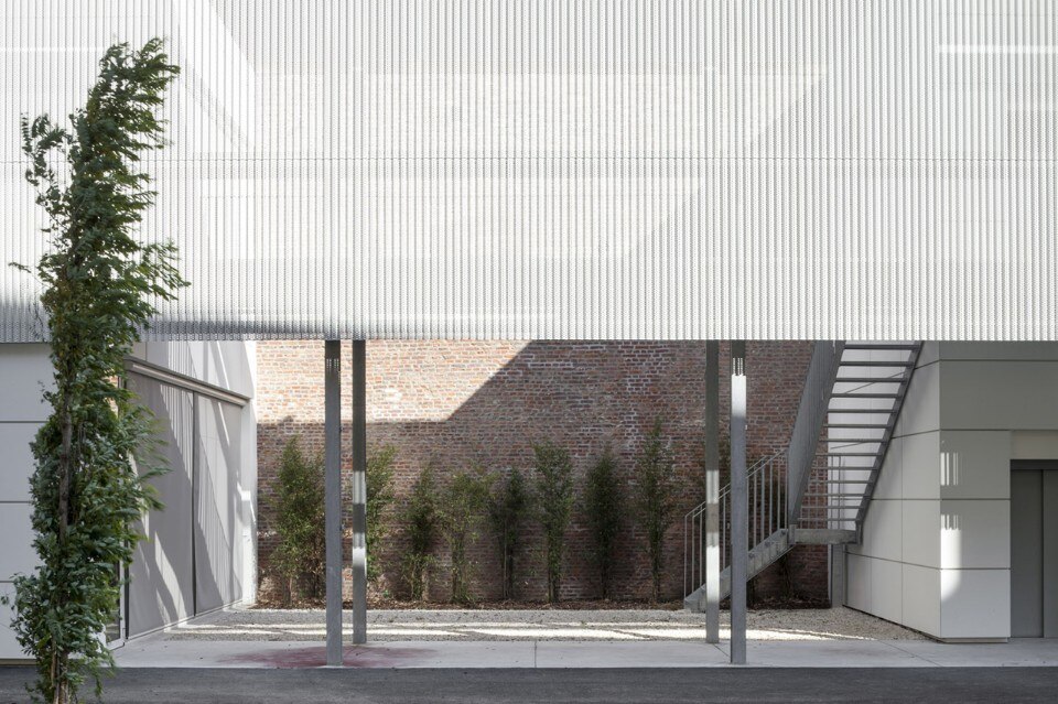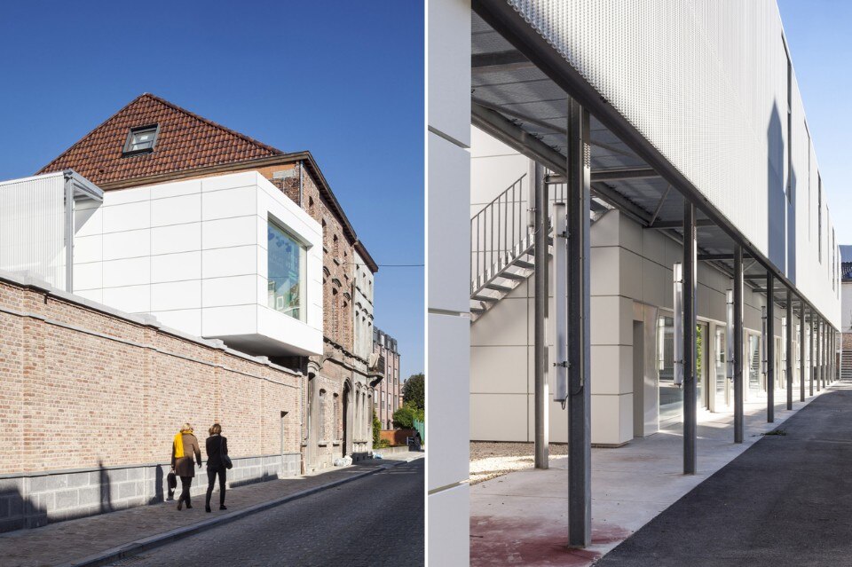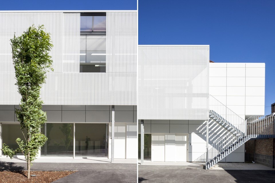 L’estensione propone un edificio che si estende per tutta la profondità del sito. Una generosa galleria-corridoio collega due volumi distinti, separati da un patio. Ciò consente la distribuzione dei locali e assicura l’unità formale dei diversi elementi. Questo passaggio è coperto con una pelle di lamiera forata e piegata, con alcune porzioni mbili. La pelle si apre e si chiude per soddisfare le esigenze e gli umori degli occupanti.