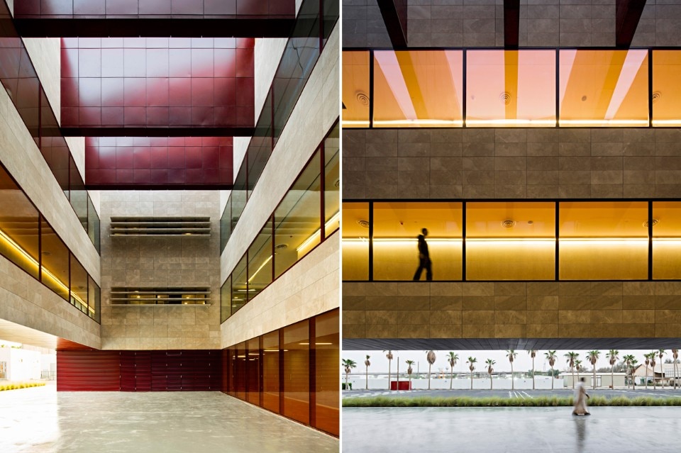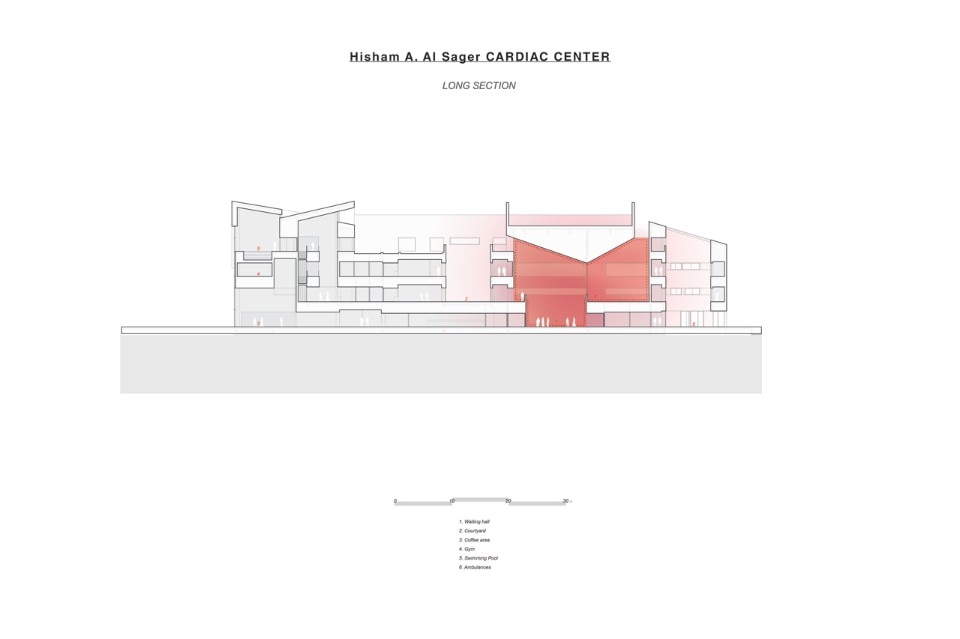 Aree di riabilitazione specializzate (piscina, palestra, pista da corsa, ecc.), servizi di ricerca e di amministrazione del centro sono strategicamente posizionati a nord, permettendo loro di aprirsi verso l’esterno lungo la baia di Kuwait City. All’interno di questo gruppo, i principali spazi di attività fisica sono a doppia altezza.