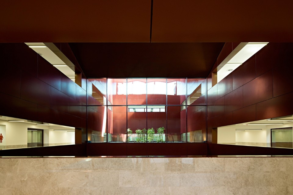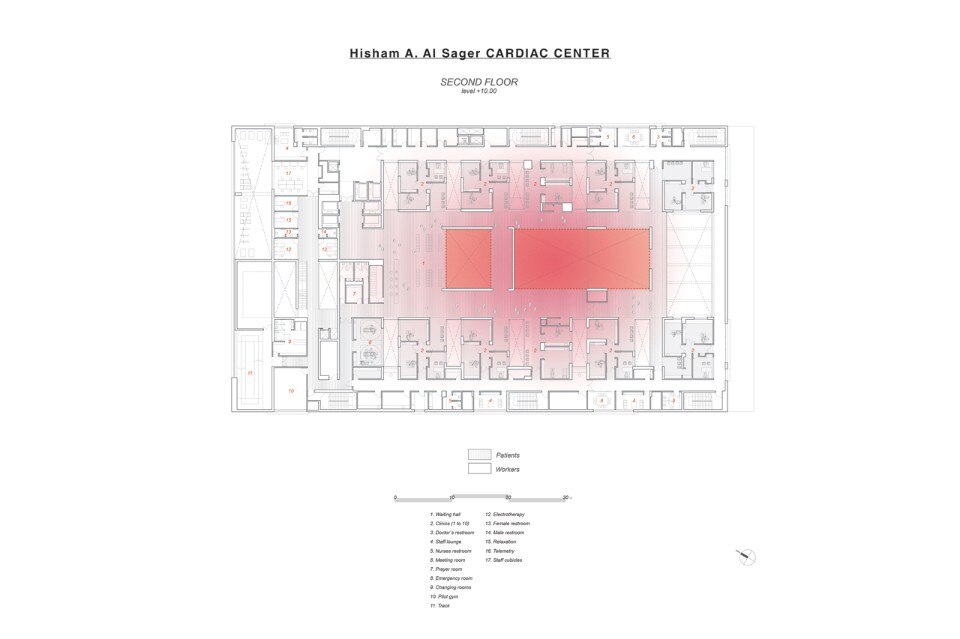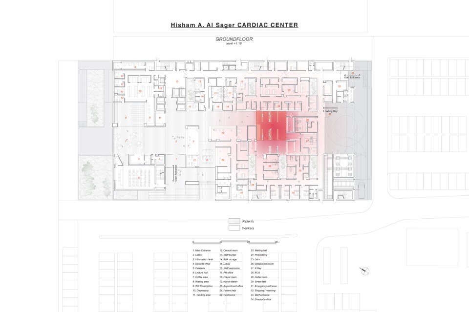 Diversi cortili offrono spazi illuminati naturalmente e di ampio respiro, in contrasto con gli ambienti piccoli che caratterizzano di solito questo tipo di edifici. I pazienti si spostano da e verso questo spazio centrale (la fonte di luce e vita), come fanno i globuli rossi, vengono ricevuti nelle cliniche e nei reparti e reimmessi di nuovo nel sistema circolatorio, una volta ri-ossigenati. La medicina cardiovascolare e l’estetica dei suoi strumenti sono stati utilizzati per creare un’architettura che propone un diverso tipo di edificio sanitario, con un atteggiamento sperimentale, che tenga conto delle esigenze specifiche degli utenti (pazienti e lavoratori) nel tentativo di rendere il loro soggiorno in ospedale migliore possibile.