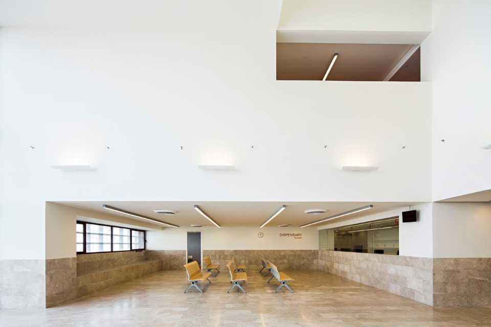 Gli ambulatori, raggruppati in tre livelli nella parte sud dell’edificio, sono disposti come piccole celle autonome specializzate (gestite da un medico e dalla sua squadra), e hanno tre spazi: due sale di esame e un ufficio di consultazione, con la propria zona di attesa. Ogni “cella” è organizzata tra i cortili, in modo che ogni ambiente abbia luce naturale, ventilazione e privacy. I pazienti e i lavoratori accedono agli ambulatori da percorsi diversi, in modo da migliorare la circolazione.
