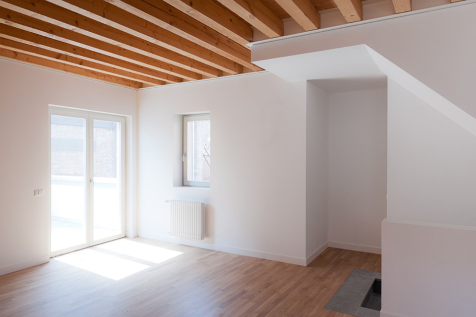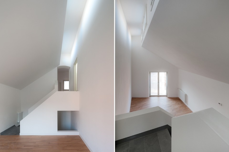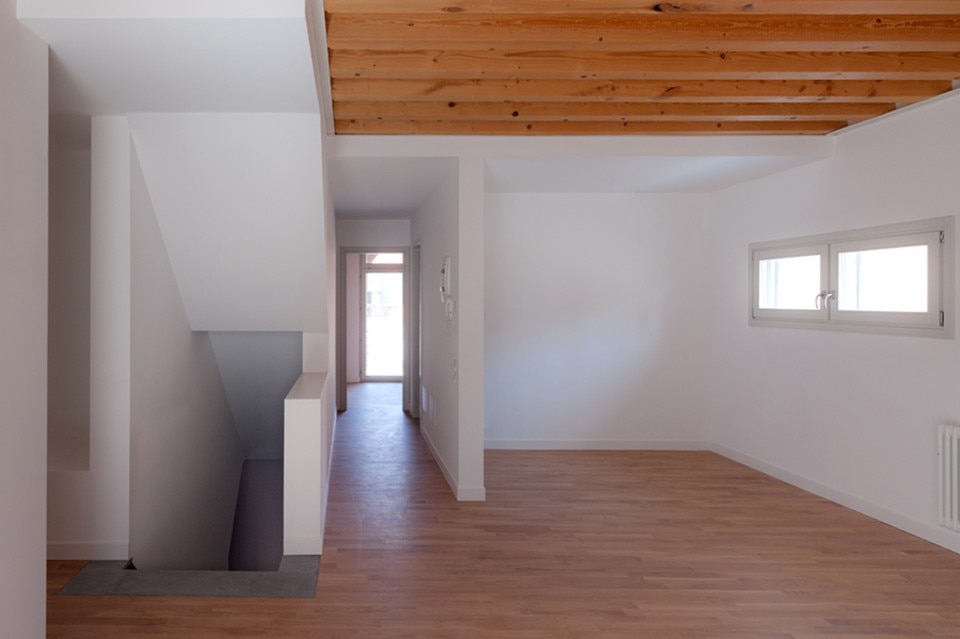 Il progetto degli alloggi riprende la tipologia del tessuto residenziale esistente. La loro organizzazione nel primo edificio è condizionata dalla facciata nord conservata come testimonianza dell’edificio industriale al quale gli alloggi sono addossati e di cui devono rispettare il ritmo delle aperture. Una serie di volumi disposti a pettine organizza i gruppi di alloggi alternando due alloggi duplex con tre alloggi simplex. L’alternanza di pieni e vuoti favorisce la penetrazione della luce da sud rendendo possibile l’illuminazione e la ventilazione naturale dei bagni.