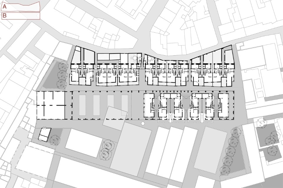 Tale alternanza consente di avvicinarsi e allontanarsi dalla lunga facciata del secondo complesso, il cui progetto (ancora in corso) prevede che sia realizzato all’interno dell’involucro dell’edificio industriale preesistente che è stato “svuotato”. Il nuovo edificio è costituito da due blocchi (otto alloggi e uno spazio commerciale per blocco) e prevede la realizzazione di una piazza coperta che costituirà il centro del nuovo quartiere.