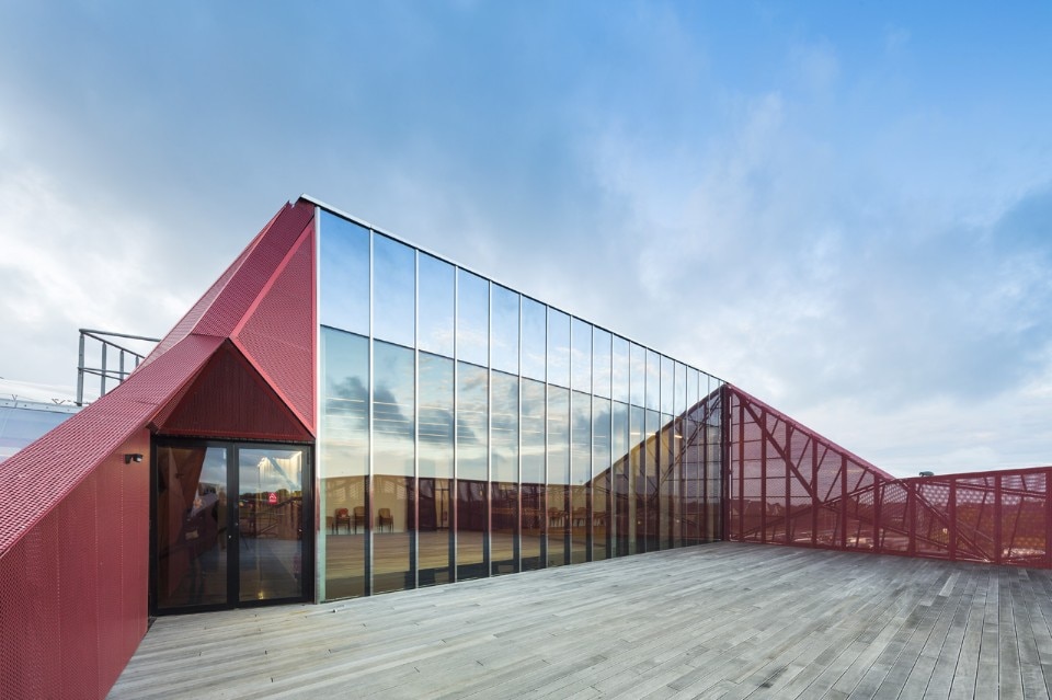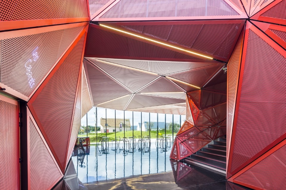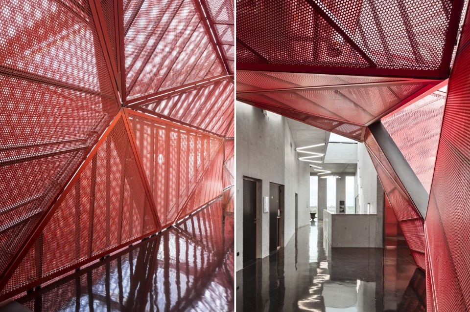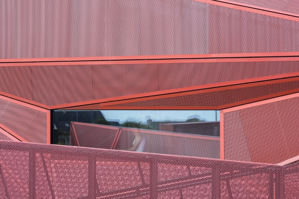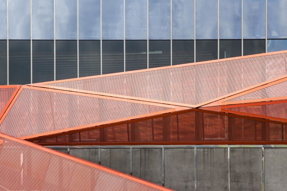 Questo percorso è come una strada, un vero e proprio spazio pubblico che segna il sistema di circolazione principale con una lobby come un punto di distribuzione per tutti gli elementi del programma. I volumi diventano scultorei grazie ai pannelli colorati di metallo anodizzato. Di giorno, il sistema di circolazione è immerso nella luce natuale, mentre di notte si accende come uno schermo. Una perforazione specifica rende i pannelli sistemi acustici capaci di assorbire il rumore della lobby. Un rivestimento in ETFE permette di sfruttare i guadagni solari invernali e di proteggere l’interno durante l’estate.