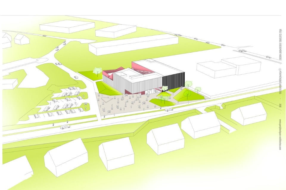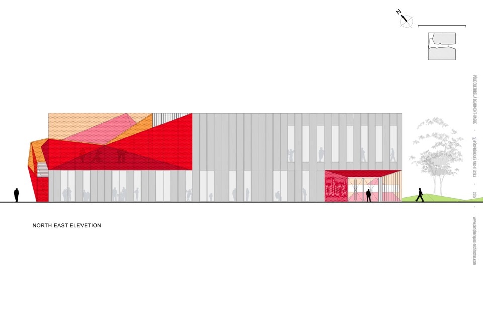 Lo spazio culturale è un grande blocco di 11x43 metri con una facciata mutevole, che alterna presenza e leggerezza. Questo edificio versatile combina programmazione funzionale, scala urbana, musica e natura. Al suo interno, la sostenibilità e la funzione sono enfatizzati e un percorso coperto “scavato” allarga l’angolo occidentale del piano terra per segnare l’ingresso.