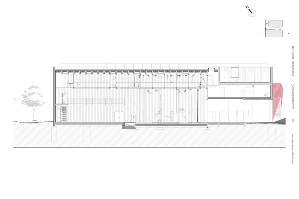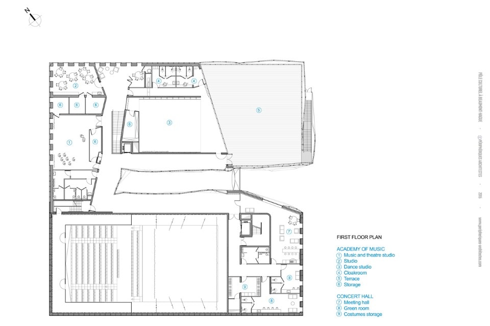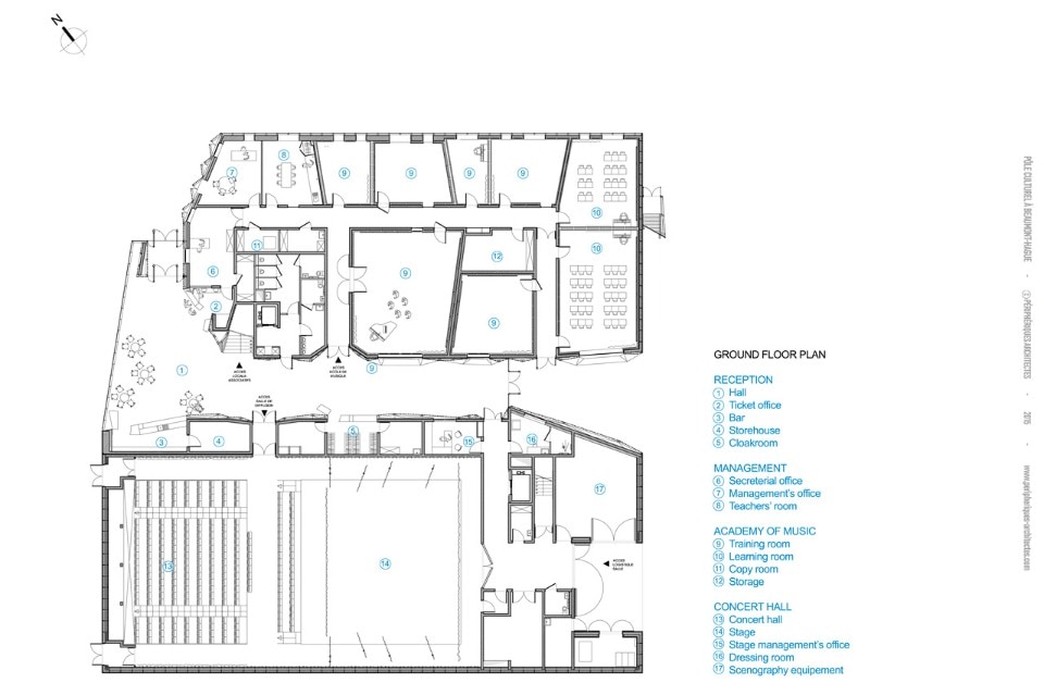 La scuola di musica vicino alla hall permette agli artisti e agli studenti di incontrarsi e suonare insieme. La diversità dei programmi è pensata per offrire momenti condivisi tra gli utenti. Dallo spazio pubblico, le attività delle associazioni sono chiaramente leggibili, in modo da favorirne la diffusione.