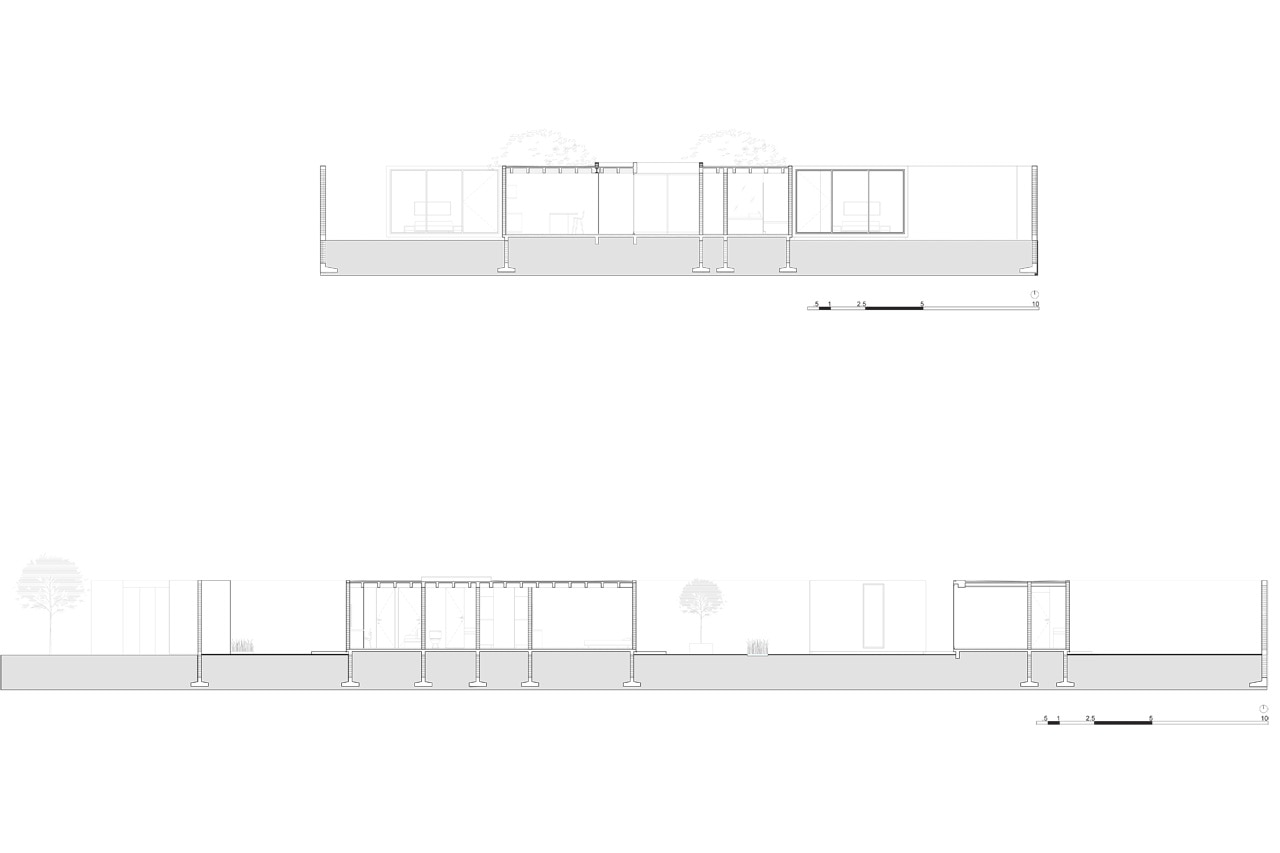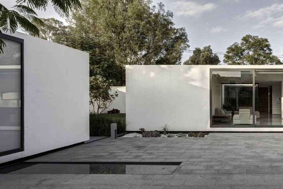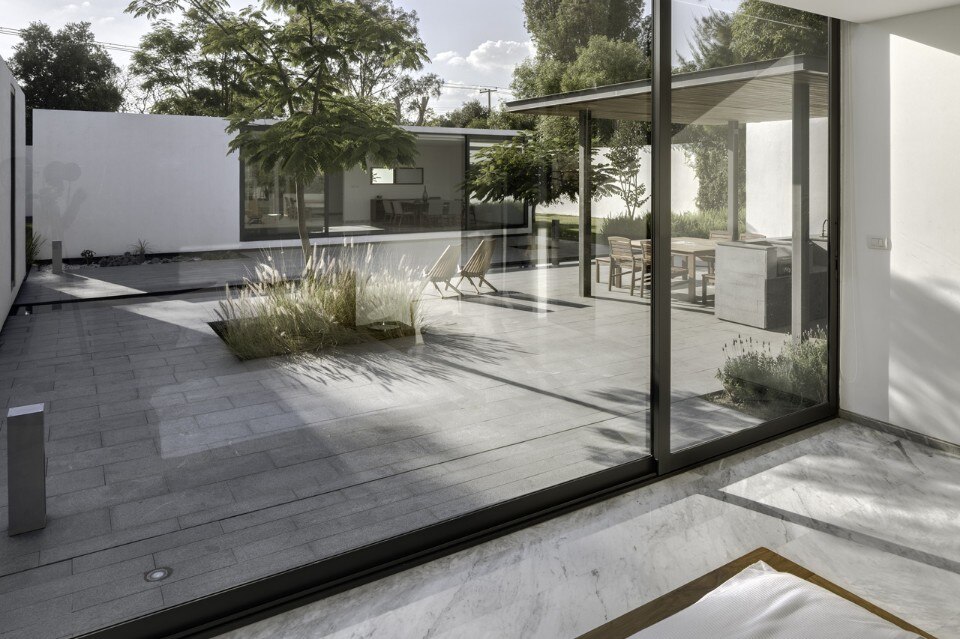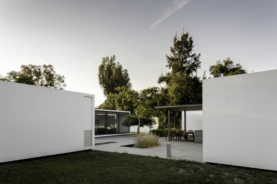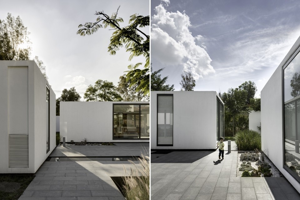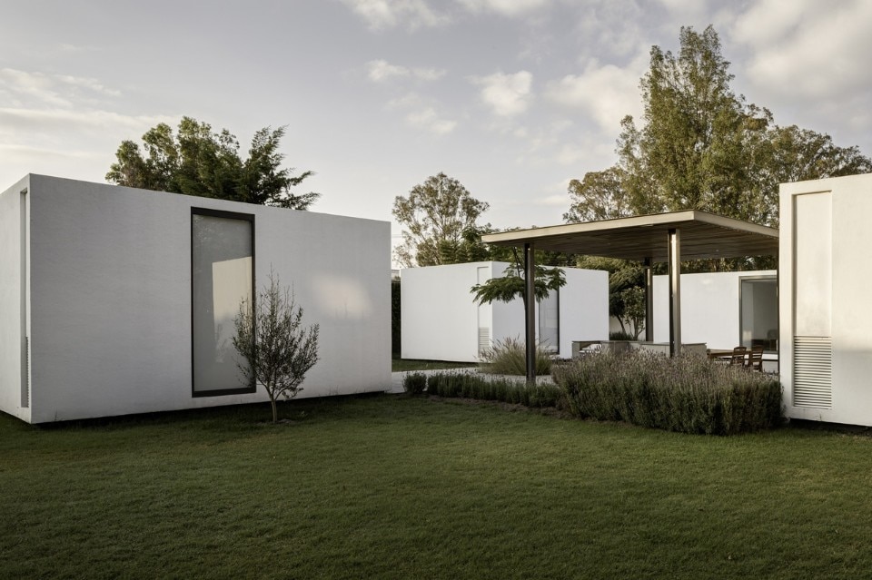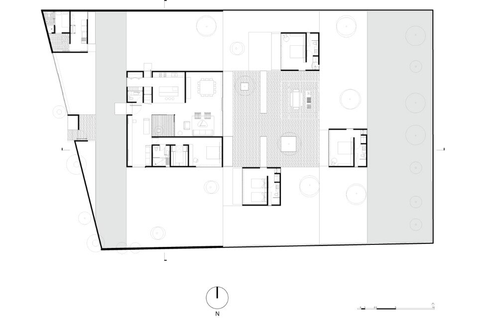 Il progetto è nato posando i quattro componenti della casa sul sito. La casa principale di circa 155 mq è accessibile da un cortile centrale che agisce come elemento di distribuzione che conduce alla cucina, alla sala da pranzo e alla camera da letto principale, così come filtro alla luce naturale per tutte le aree pubbliche. Le suite di soli 25 mq disegnano un gioco di ombre intorno alla piazza centrale, e ciascuna contiene una camera da letto, un bagno e un guardaroba, in modo da essere indipendenti dalla casa.