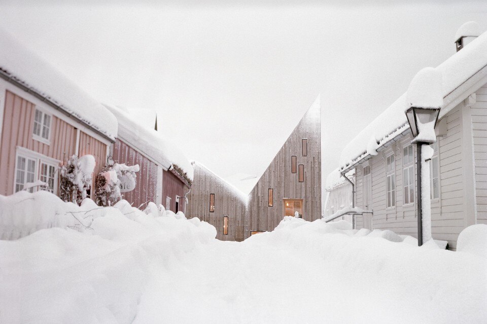 Il pino è il materiale da costruzione principale del museo, con cui sono realizzate pareti esterne e tetto (rivestitii di olio biologico), sostenuti da travi di acciaio.