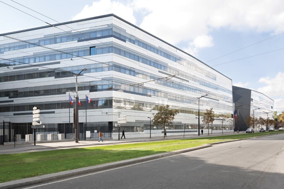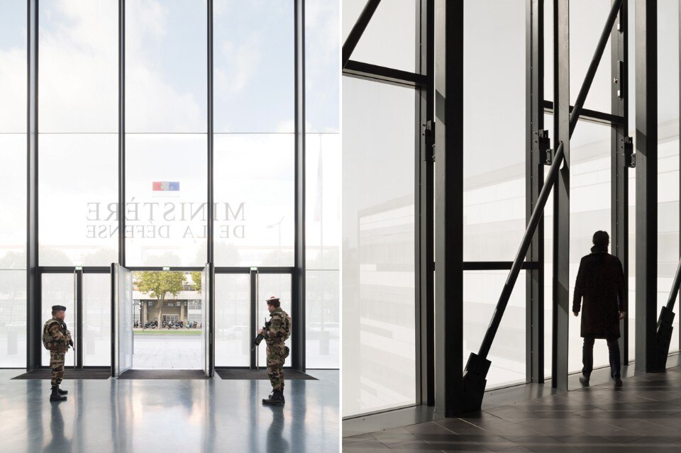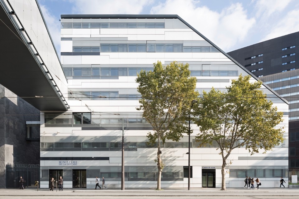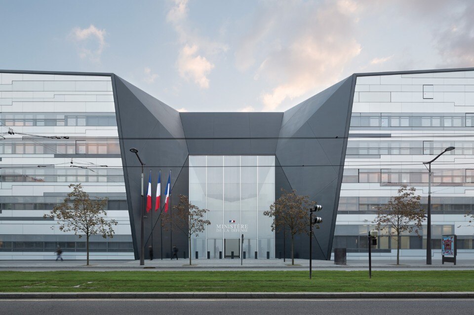 L’esterno disegna un lungo involucro bianco che evoca la sede di un ente che lavora per preservare gli equilibri del mondo. Dalla circonvallazione appare solo la copertura, interpretata come una quinta facciata che si lega alla topografia, un paesaggio insolito nella cornice parigina. Tre camini punteggiano questo origami di pannelli di metallo e vetro solare a simboleggiare le tre forze armate dell’esercito. Costruito su pali, l’edificio è un rizoma, le cui altezze variano per raggiungere la stanza centrale, più alta, dedicata alle gerarchie superiori.