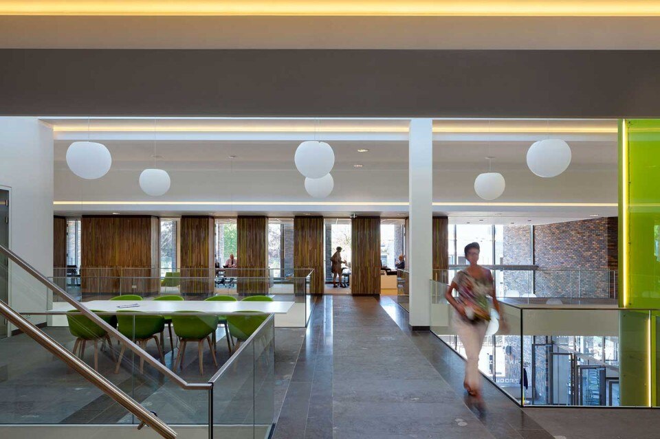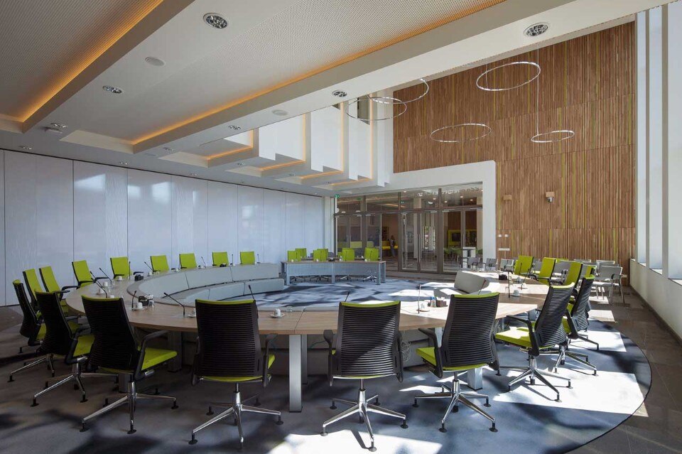 Materiali naturali come il legno e la pietra sono i protagonisti degli interni. Questo si combina con accenti verdi che creano armonia visiva. L’attenzione all’acustica e alla luce naturale e un layout giocoso rendono il municipio un luogo stimolante, in cui i visitatori e il personale si sentono a casa.