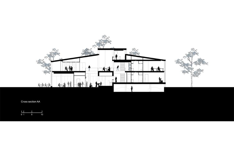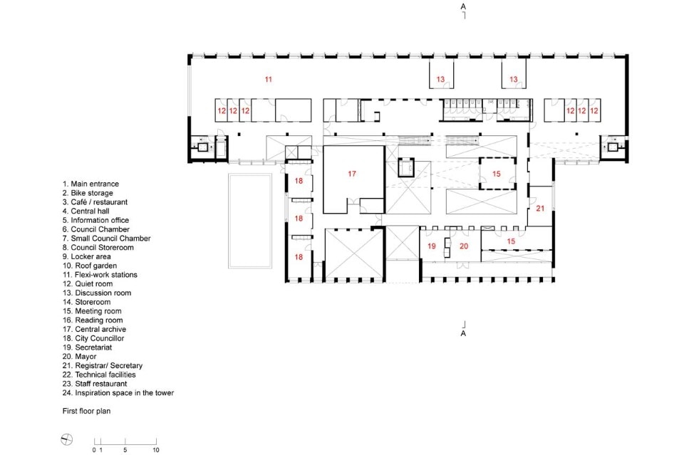 L’area pubblica al piano terra comprende, tra le altre cose, il Dipartimento Affari Civili, la Camera del Consiglio e di un ristorante, con gli uffici del sindaco e degli assessori al piano di sopra. L’ufficio si trova sul lato opposto dell’atrio, sopra il parcheggio interrato. La separazione tra le aree aperte al pubblico e le aree di lavoro è progettata per essere auto-esplicativa, senza alcun accesso limitato tangibile.