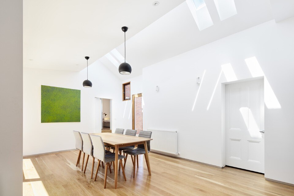 La facciata principale è stata schermata con del vetro opacizzato, mentre dalla strada gli elementi nuovi appaiono leggeri, quasi come se galleggiassero tra i due edifici. La luce del sole penetra nell’edificio sia attraverso i lucernari della sala da pranzo, sia attraverso la porta di vetro esterna.