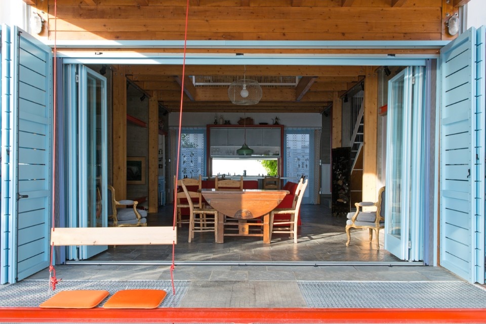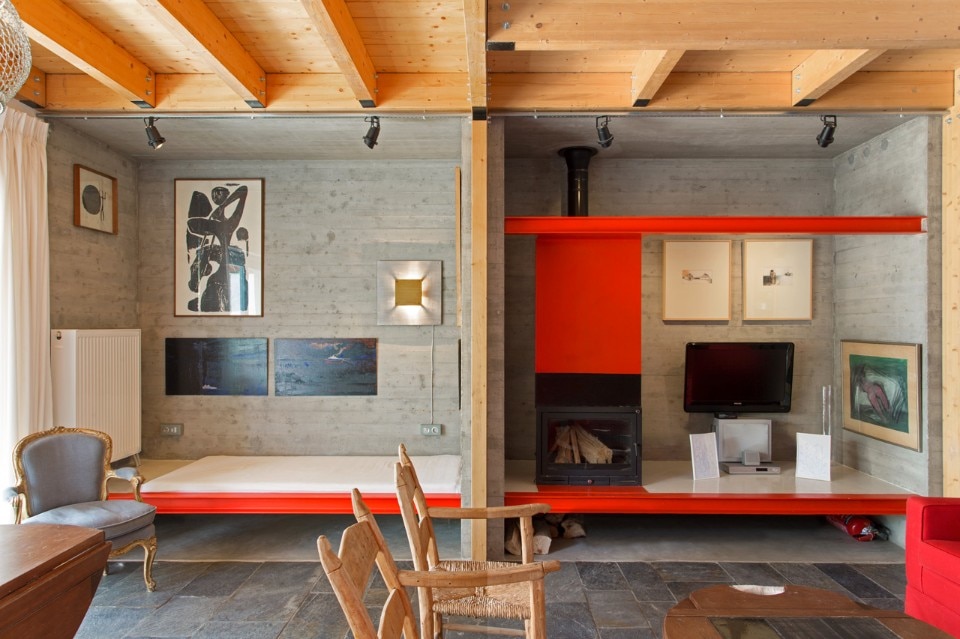 Tipologicamente la casa potrebbe essere paragonata a una basilica, con un atrio all’interno. Lo spazio principale, è largo 4,30m ed è organizzato secondo una griglia di quattro pilastri distanti 2,60m tra loro. Le due ali laterali sono larghe 1m e ospitano gli spazi di servizio (scala, armadio, bagno e cucina). La costruzione dell’edificio materializza la tipologia della casa: le due navate laterali sono in calcestruzzo mentre lo spazio principale è una scatola in legno che si adatta ai lati in cemento.