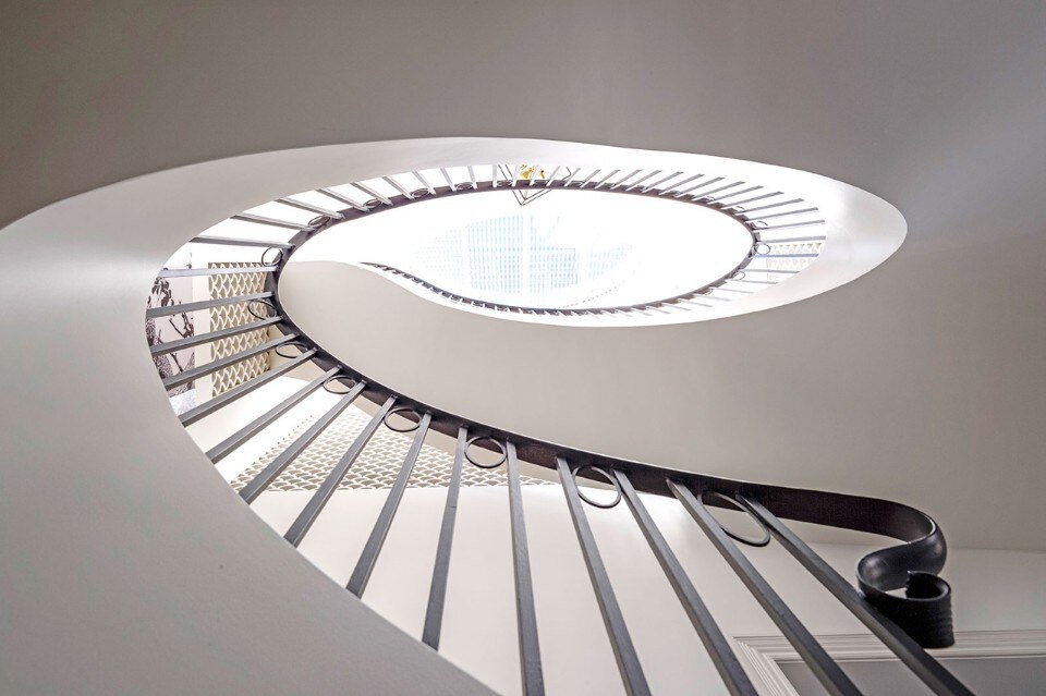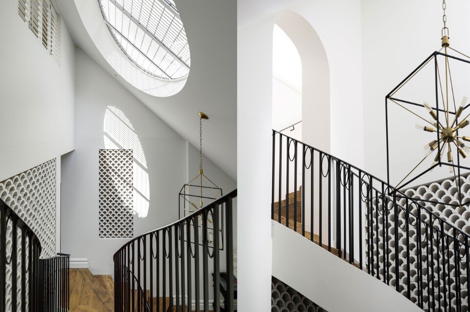 Luigi Rosselli Architects, Casa Twin Peaks, Darling Point, Australia. A destra: attraverso un arco, la scala attraversa le antiche mura del cortile per collegarsi all'attico.