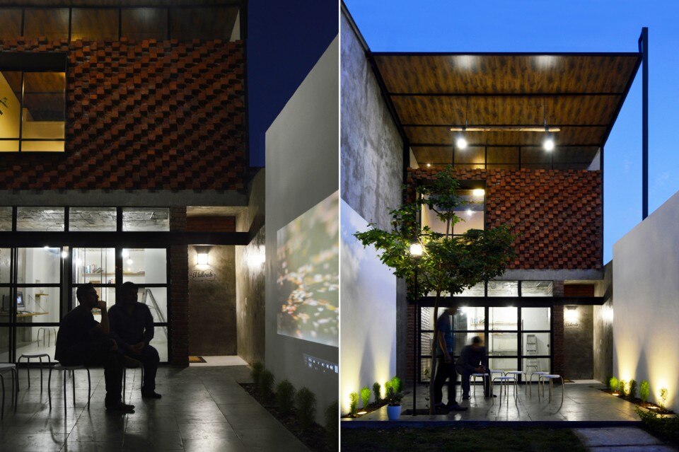 Gli architetti hanno lavorato sulla matericità degli involucri, sperimentando nuovi possibili usi per elementi costruttivi locali, di uso comune ed economici. Per favorire il dialogo con il patio esterno, il piano terra è completamente vetrato, le sue aperture si possono aprire e impacchettare. In questo modo il piano terra diventa uno spazio lo spazio centrale per le attività dei due studi. Gli architetti hanno cercato il giusto equilibrio tra materiali leggeri e pesanti, tra simmetria e asimmetria, tra materiali lucidi e grezzi.