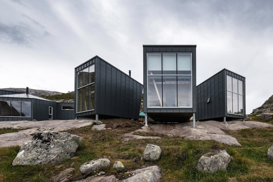 Lo studio norvegese KOKO architects ha progettato Skåpet Mountain Lodges a Soddatjørn, un rifugio di montagna di facile manutenzione costruito con materiali prefabbricati.