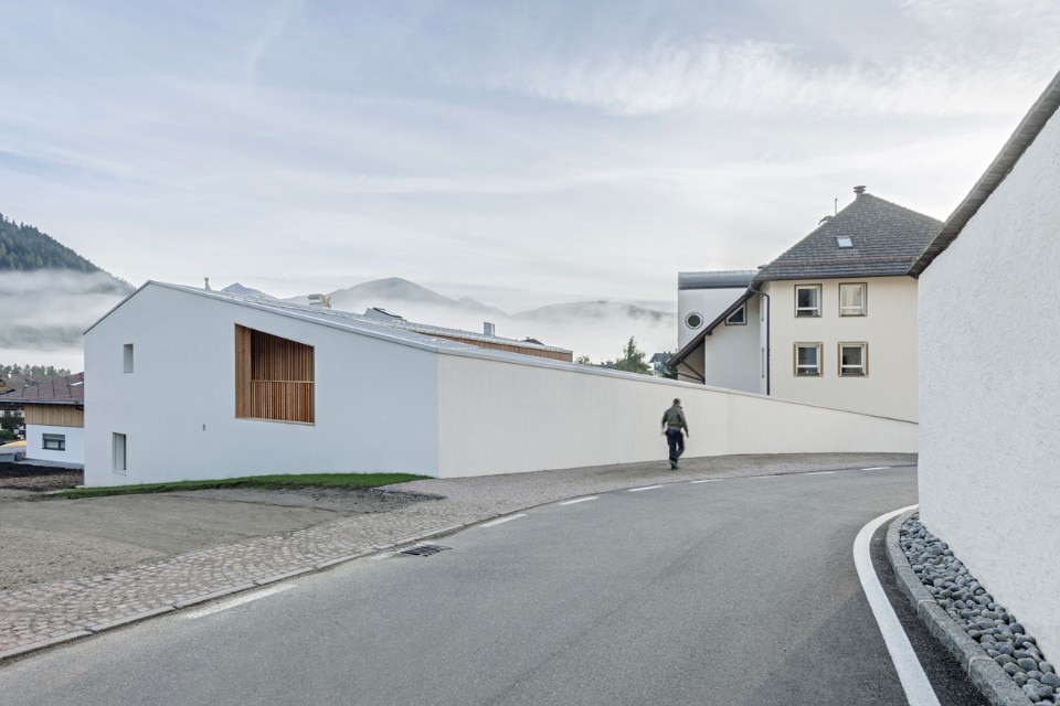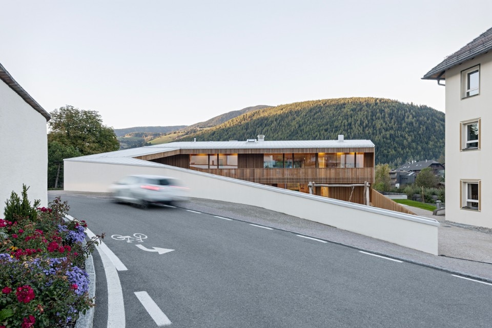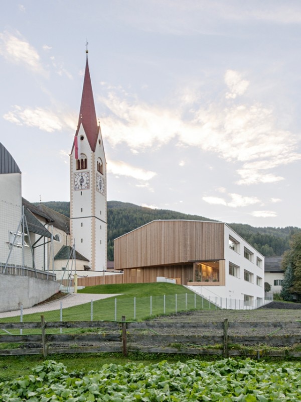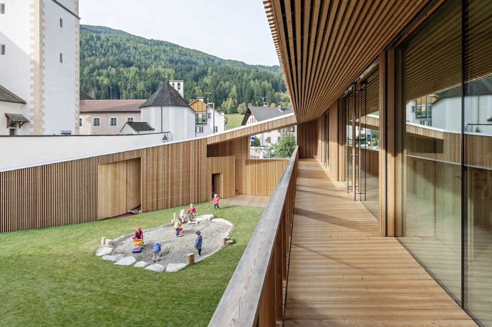 Gli interni della scuola materna e il suo giardino sono considerabili un tutt’uno, garantendo libertà architettonica e le necessarie condizioni di sicurezza. L’edificio compatto si trova sul limite settentrionale del lotto, in modo da non togliere luce al giardino. In questo modo si separa otticamente e funzionalmente lo spazio-giochi dalla strada.