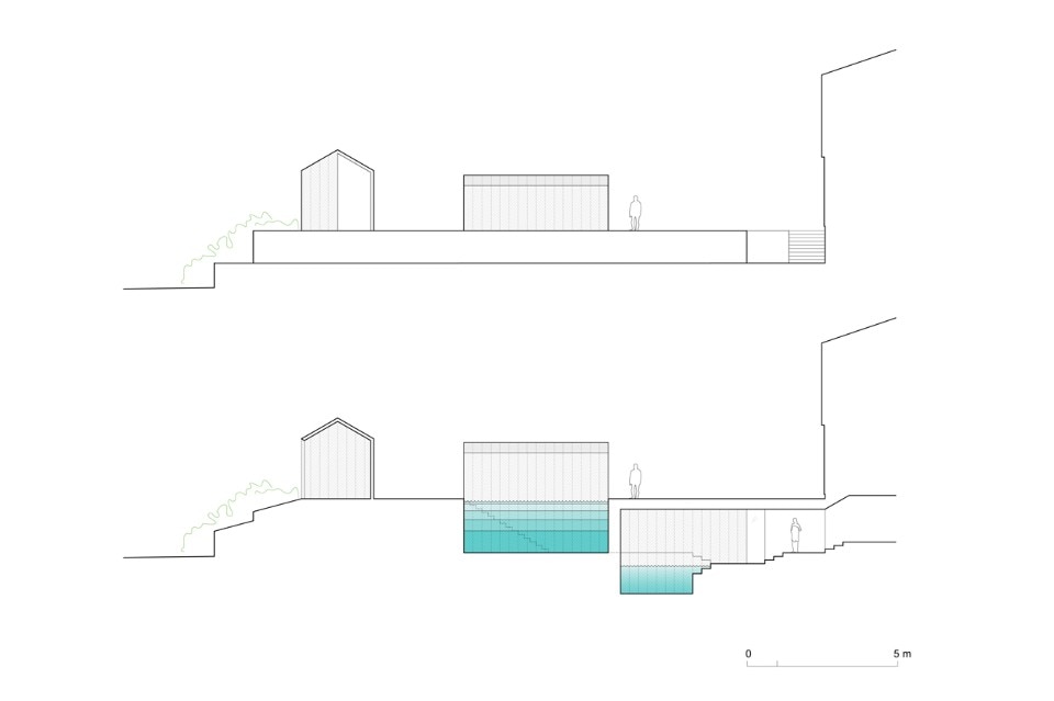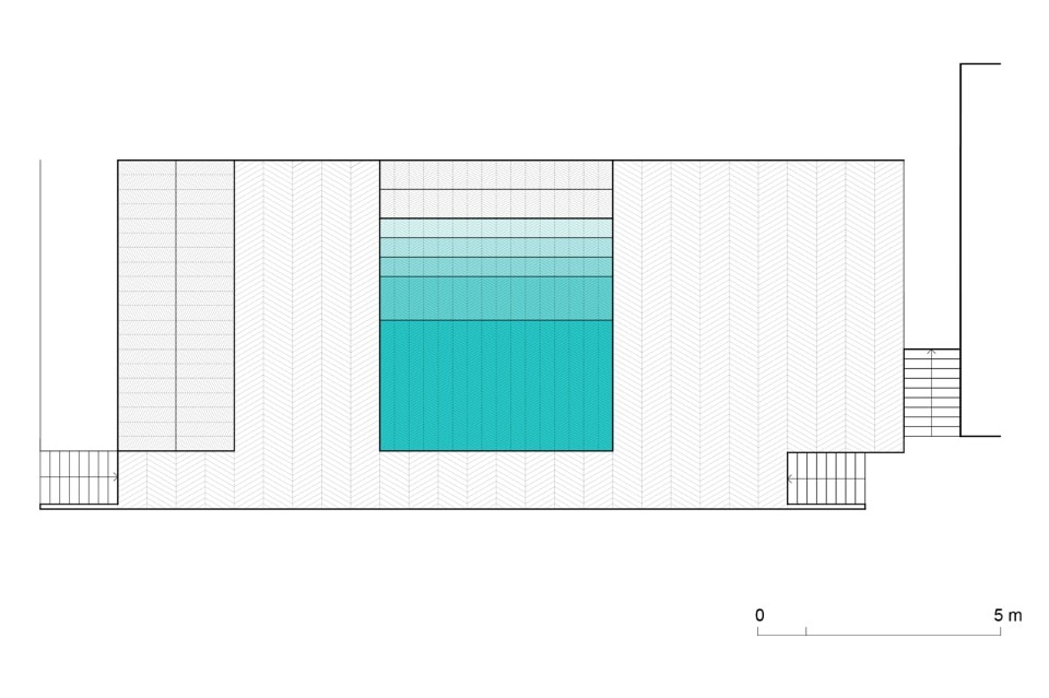 La piscina coperta è invece nascosta, all’interno del podio. Si può dire che le piscine siano quasi sovrapposte. Le due aree termali sono distinte e separate. Quella esterna è sporgente mentre quella interna è scavata. Ma entrambe condividono lo stesso pattern di materiali.