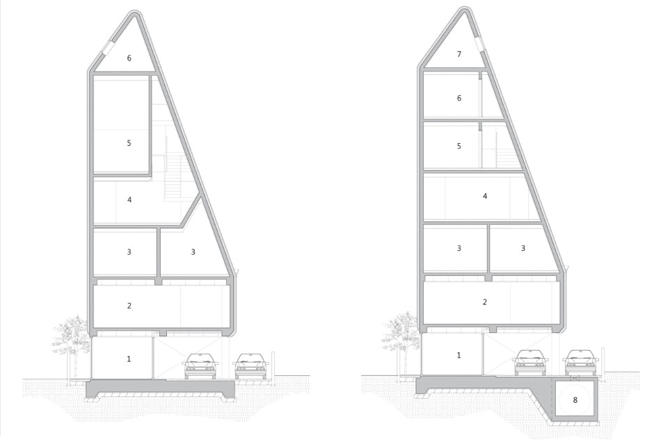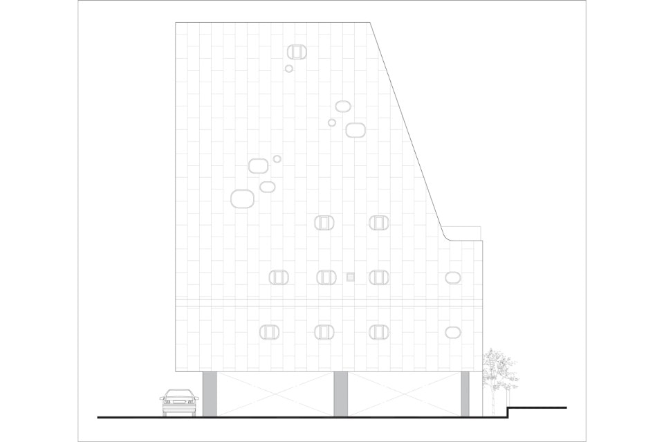 Il calcestruzzo è il materiale principale utilizzato per l’edificio. Per migliorare le prestazioni termiche e per riparare l’edificio dagli agenti atmosferici, la struttura è stata rivestita da uno strato di acciaio che, come una coperta, copre la parte superiore dell’edificio. Nonostante il panorama non sia dei migliori, le ampie finestre dalla forma irregolare danno la possibilità di guardare il cielo e portano luce abbondante nella residenza.
