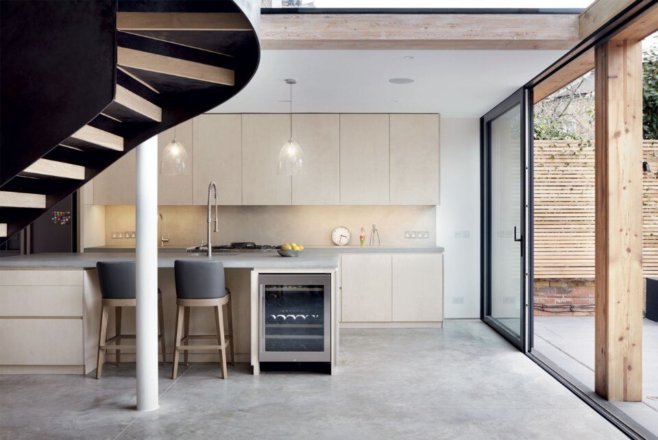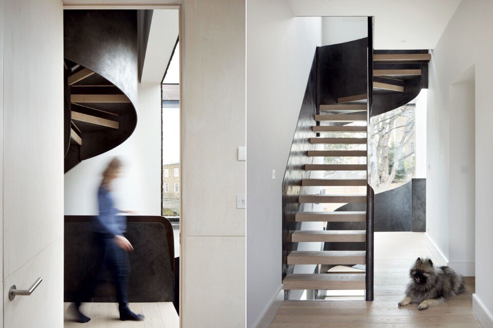 L’estensione posteriore è un innesto leggero di legno lamellare strutturale, che incornicia una serie di spazi contemporanei collegati alla vecchia casa con una scala di acciaio su misura. La scala è il nuovo cuore della casa, un elemento meticolosamente studiato in tutti i suoi dettagli che crea un accesso scultoreo e definisce gli spazi che connette.
