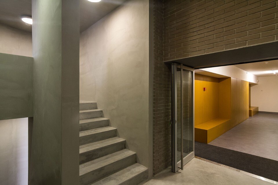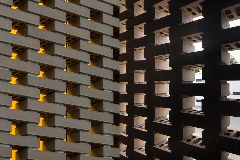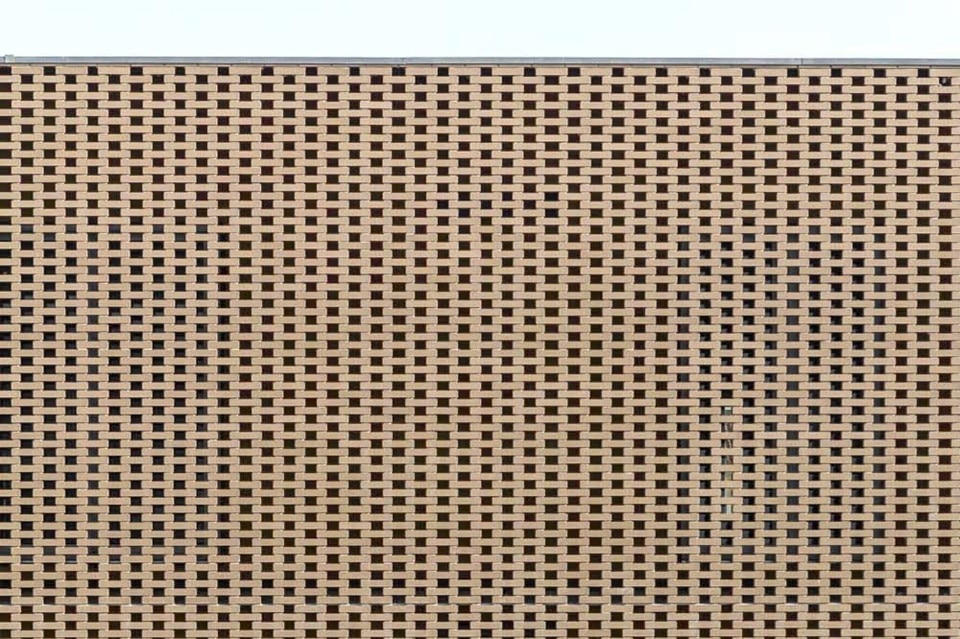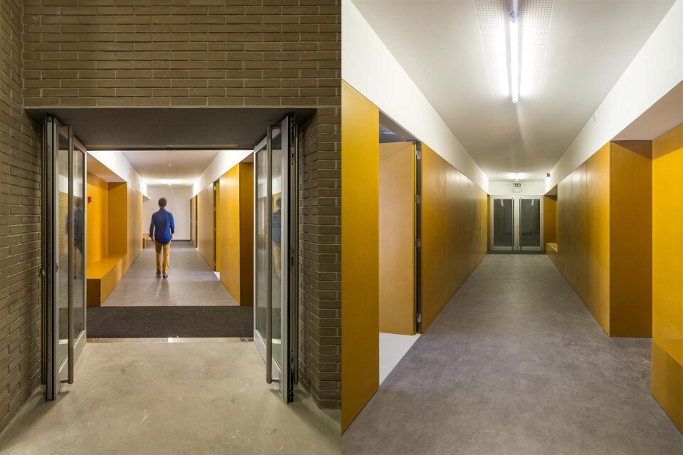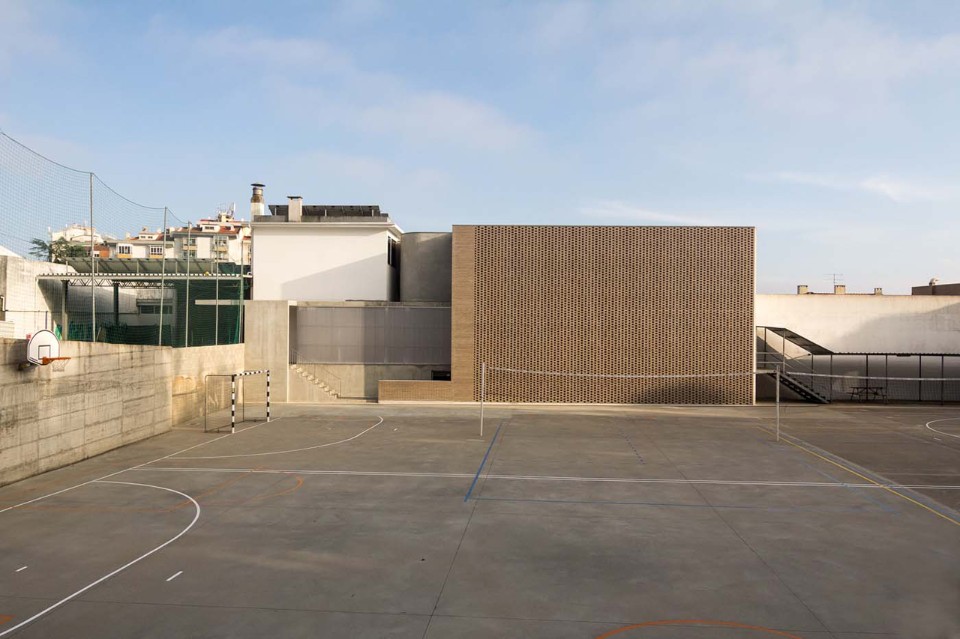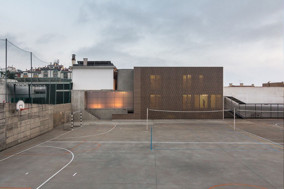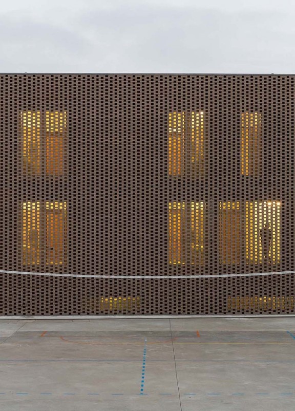 Il nuovo edificio è allo stesso tempo un punto di connessione e di articolazione: collega gli edifici a est e ovest, e distribuisce i livelli del cortile esterno a sud, dell’area sportiva e della zona esterna coperta. Gli architetti avevano l’obbligo di utilizzare la ventilazione naturale, proteggendo le aperture a nord: hanno quindi deciso di creare una facciata permeabile di mattoni per garantire il flusso d’aria, luce naturale, protezione delle finestre e mimetizzazione delle griglie di ventilazione. Nel lato sud, invece, il controllo luminoso delle aule è stato regolato da frangisole esterni, e schermature interne.