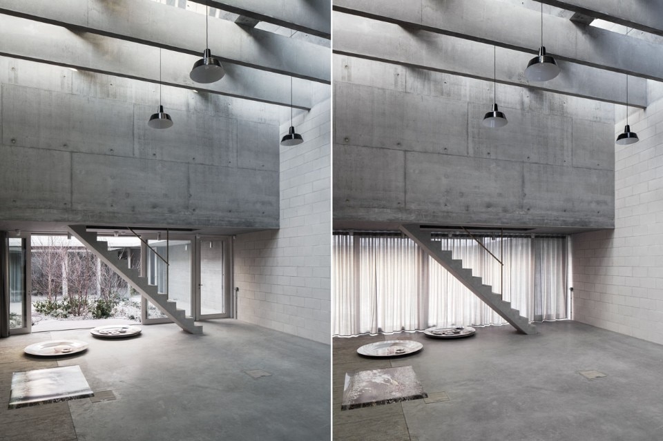 Gli spazi sono connessi tra loro con delle porte vetrate larghe quanto tutto l’edificio. In questo modo è molto sottile la divisione tra spazio interno ed esterno. La natura pervade tutta la struttura e attraversa i vari confini permeabili. L’ingresso è illuminato dall’alto ed è uno spazio a tripla altezza, attraversato da un ponte di acciaio. Da qui si arriva agli uffici e agli studi per la post-produzione tramite una scala antincendio vetrata, che funziona anche da lucernario. L’atelier è lo spazio più pubblico del progetto, collegato all’esterno con una grande vetrina.