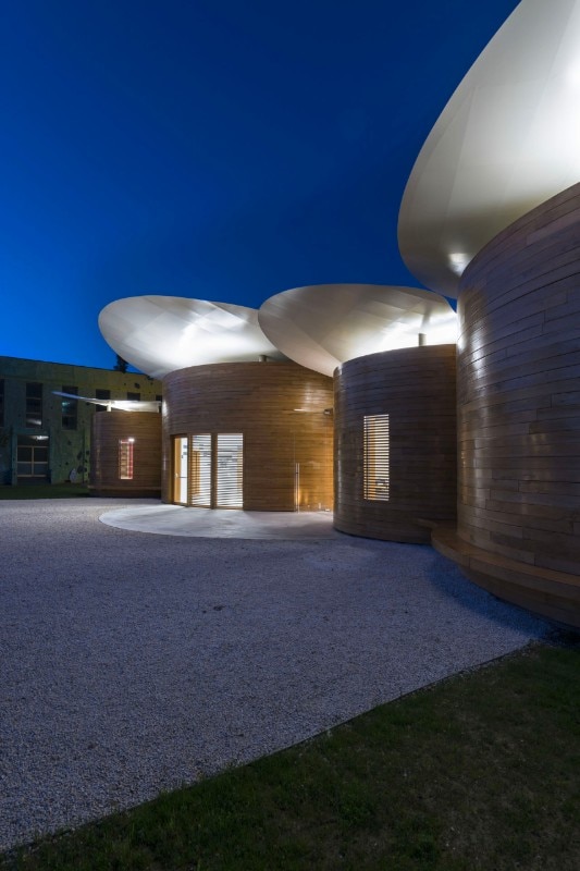 La risposta è stata una struttura diffusa, il cui linguaggio architettonico si ispira alla radicata tradizione musicale della città. L’edificio è costituito da nove piccoli laboratori musicali di forma circolare, collegati da una piazza che funge da spazio distributivo e che diventa luogo per la condivisione e il dialogo tra i giovani musicisti. Questa area centrale è destinata anche alle prove di musica d’insieme e a piccoli saggi.