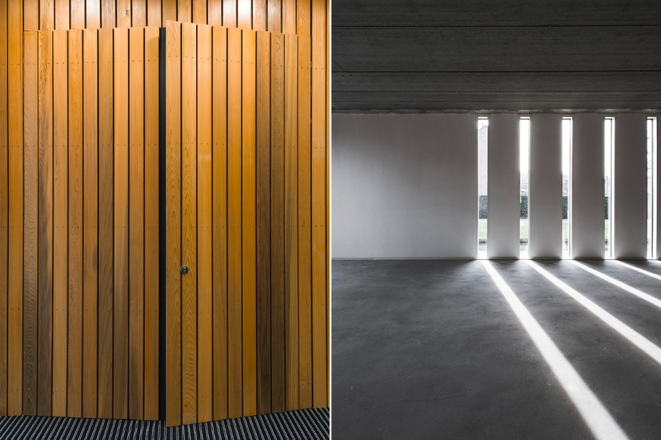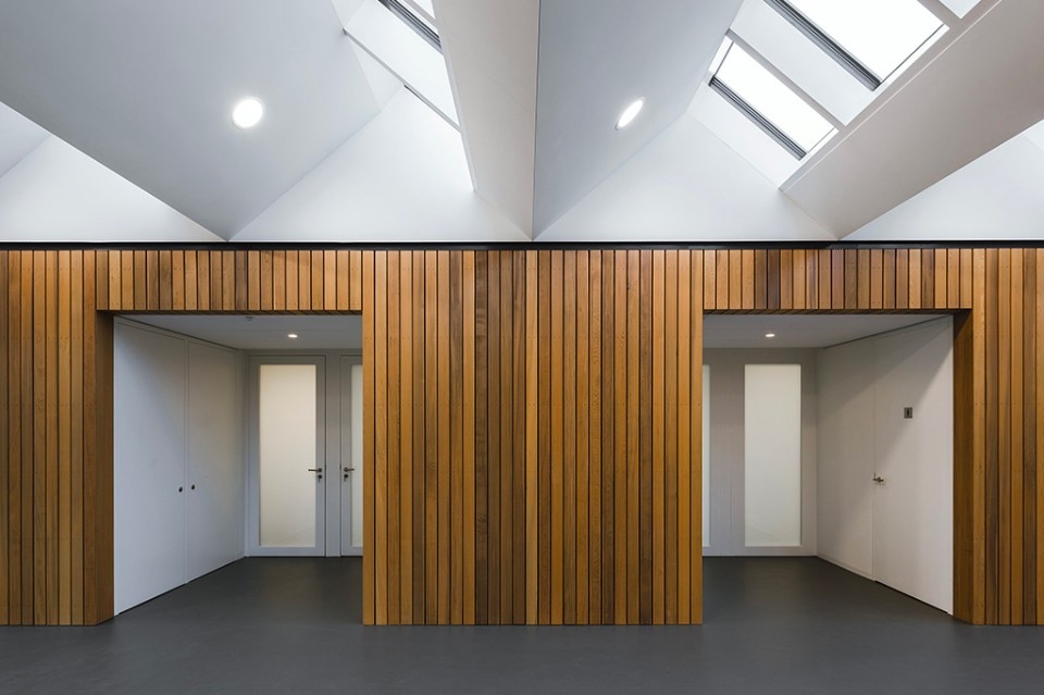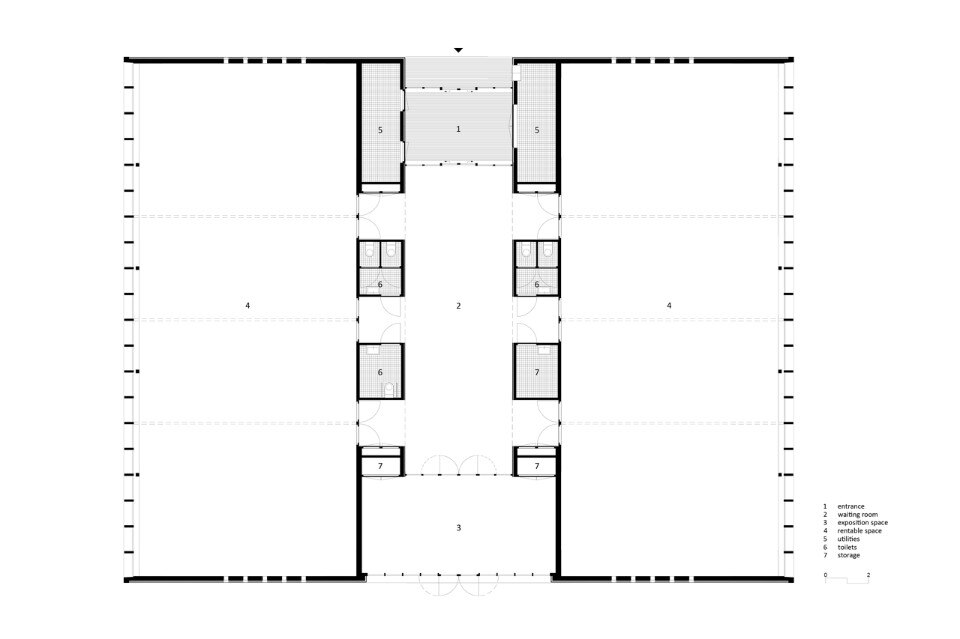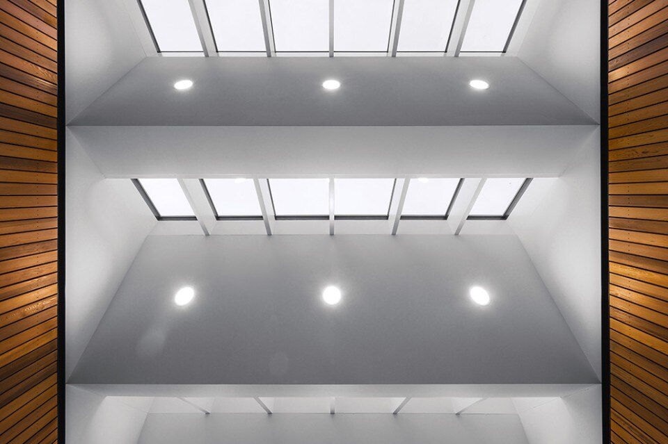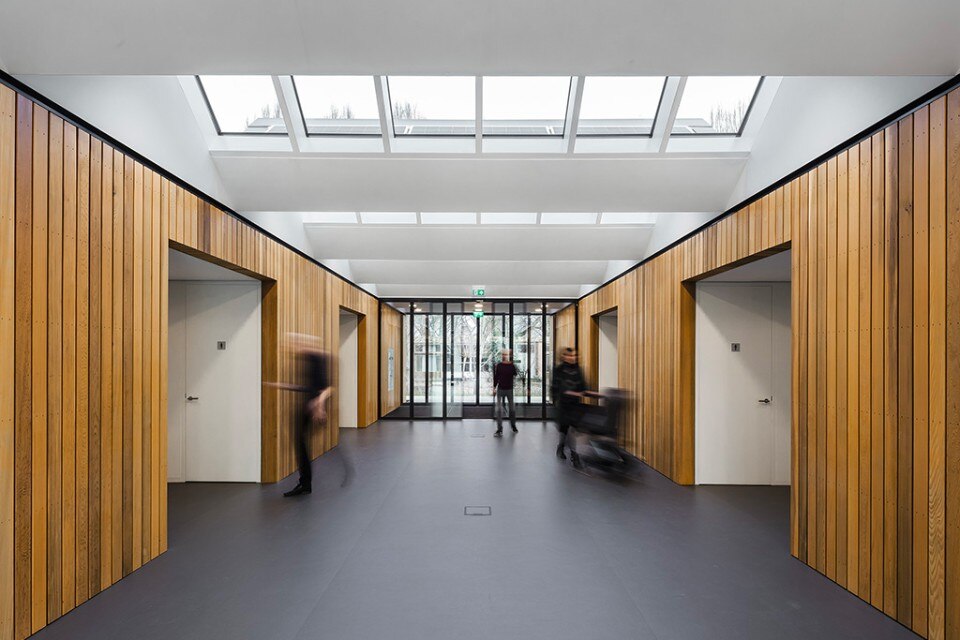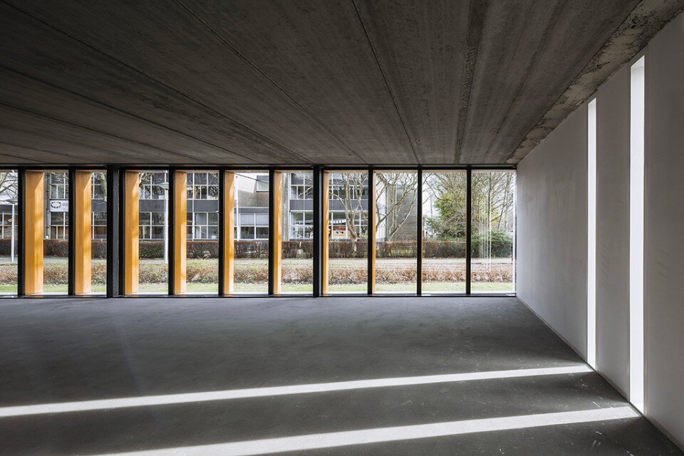 Lo spazio centrale è immaginato come una strada pubblica, da cui è possibile accedere alle varie funzioni, che hanno un ingresso indipendente. L’ambiente centrale è trasparente. È accessibile a tutti e collega l’ingresso sul versante nord con un piccolo specchio d’acqua a sud. Le vetrate e i lucernari, assieme ai pannelli di legno, generano un luogo aperto, caldo e accogliente.