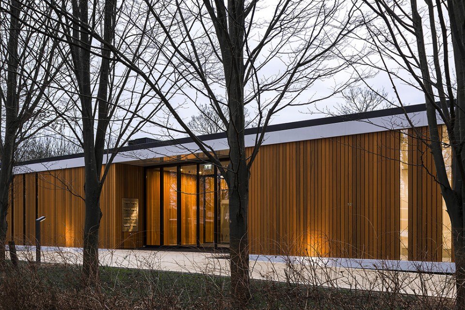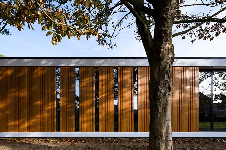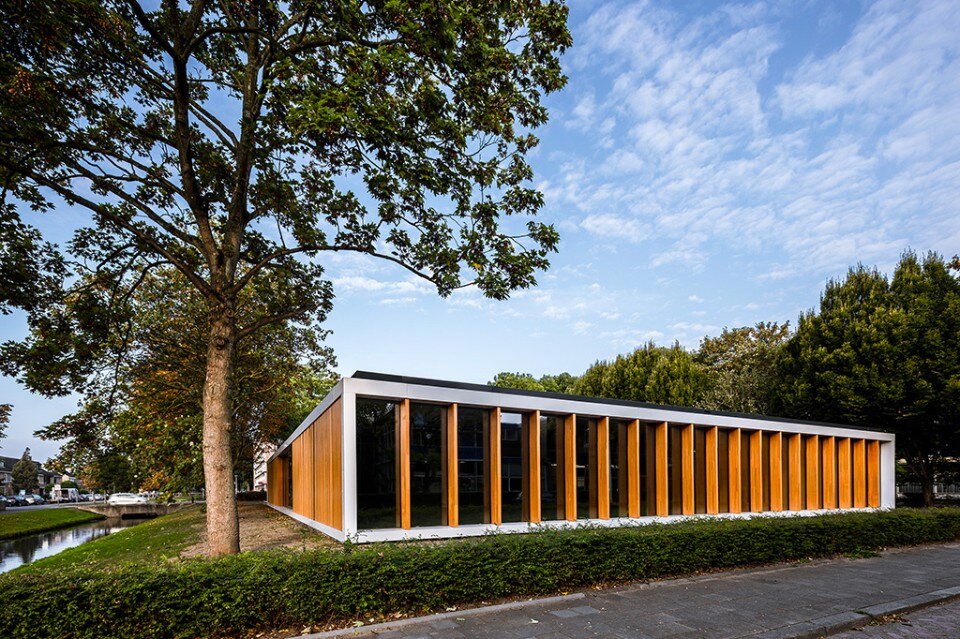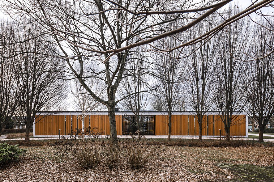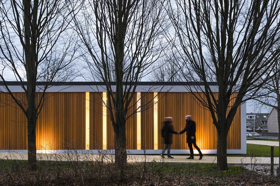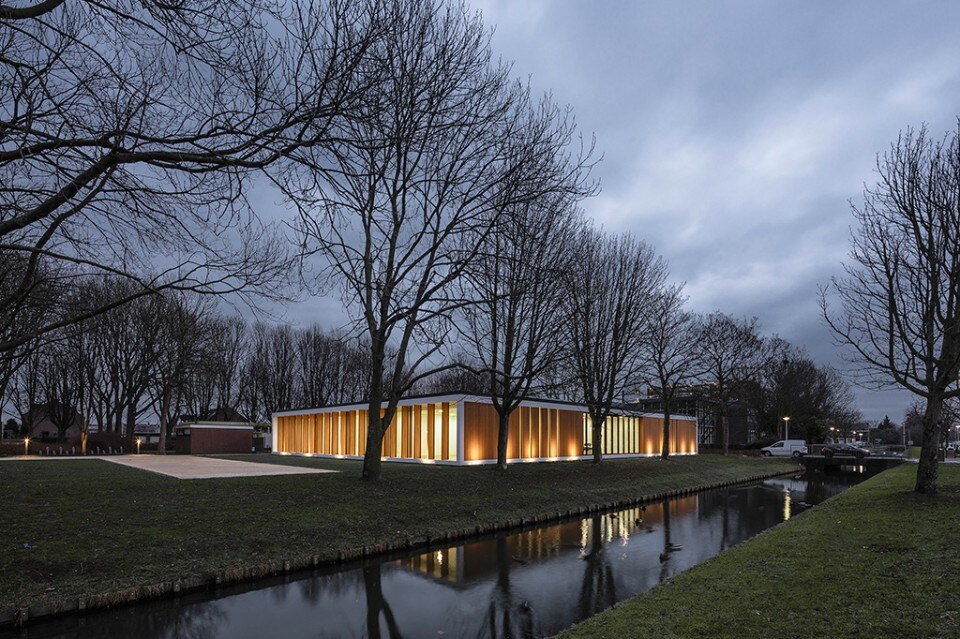Lo spazio centrale è immaginato come una strada pubblica, da cui è possibile accedere alle varie funzioni, che hanno un ingresso indipendente. L’ambiente centrale è trasparente. È accessibile a tutti e collega l’ingresso sul versante nord con un piccolo specchio d’acqua a sud. Le vetrate e i lucernari, assieme ai pannelli di legno, generano un luogo aperto, caldo e accogliente.