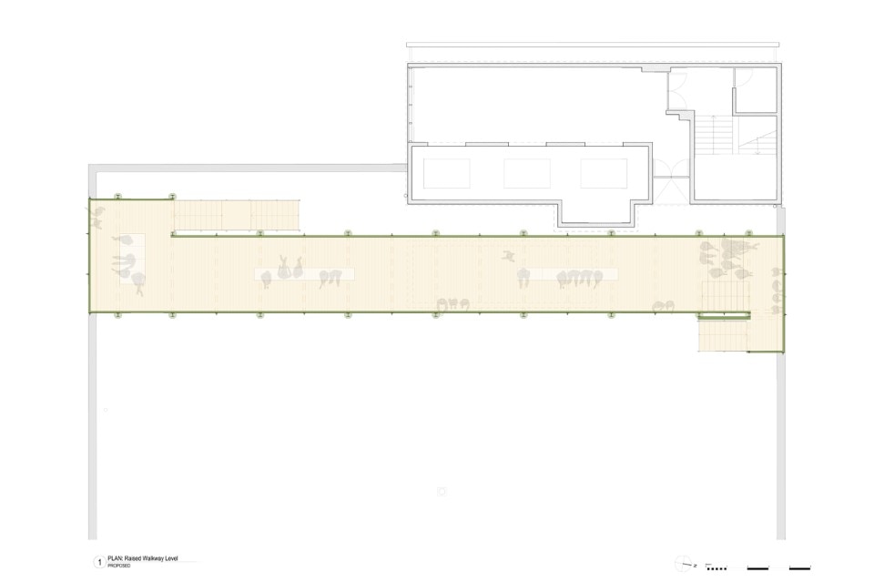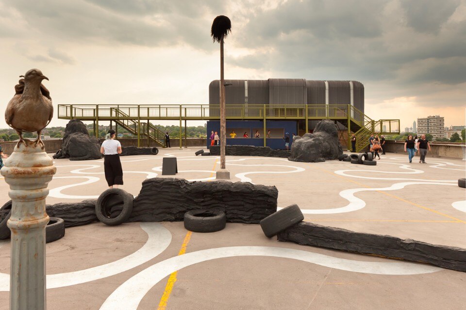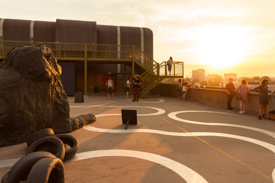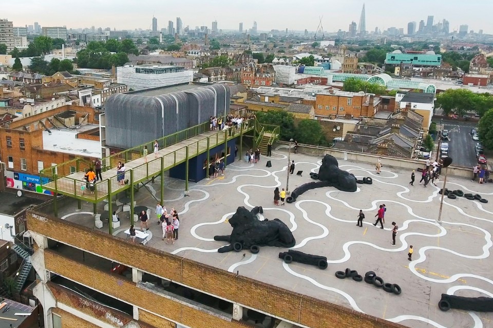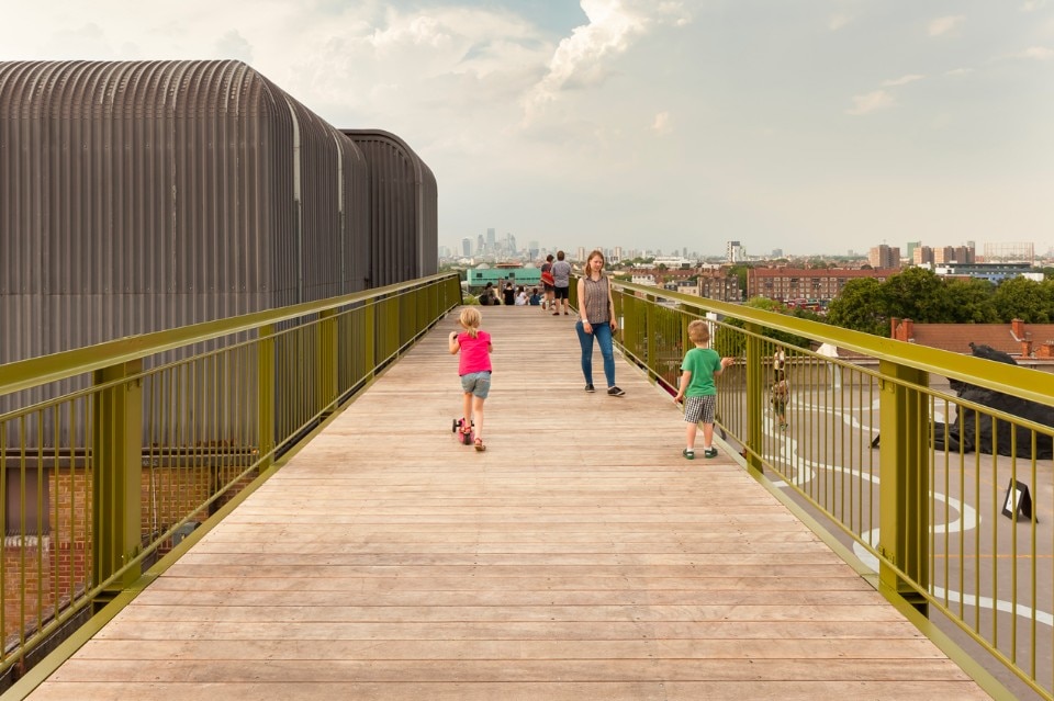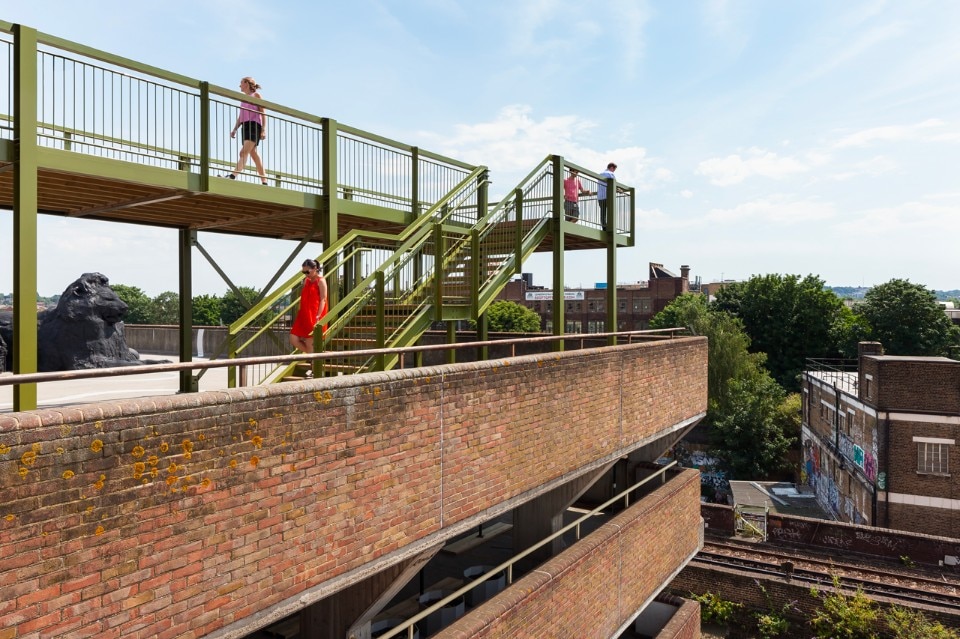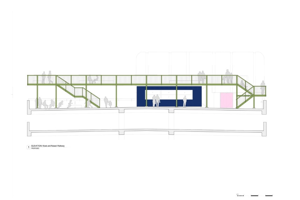La piattaforma e gli scalini sono di legno massello. Sono previste anche tre aree relax che comprendono panchine personalizzate e sdraio. La parte superiore dei corrimano è formata da un profilo angolare per offrire posti dove poggiarsi, sporgersi e riposare naturalmente, e da cui apprezzare le opere d’arte e le attività in corso. Sotto la struttura di acciaio si trova un volume verniciato di blu scuro. Questo chiosco è uno spazio necessario a Bold Tendencies e serve da punto informativo, negozio e biglietteria. Funzionerà anche come centro per il programma educativo Bold Everywhere.