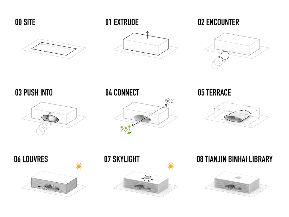 MVRDV, in collaborazione con il Tianjin Urban Planning and Design Institute (TUPDI), ha realizzato la Tianjin Binhai Library. La biblioteca è parte di una pianificazione più ampia per la creazione del distretto culturale della città. L’edificio non è solo un centro educativo, ma è un noto fondamentale per la connessione urbana del nuovo polo con il parco limitrovo. L’edificio si schiude con un’apertura ovale verso l’Occhio, una sfera di specchi che contiene un auditorium, situata al centro dell’atrio. Le librerie simulano le forme del paesaggio, formando dei terrazzamenti che arrivano fino alla facciata.