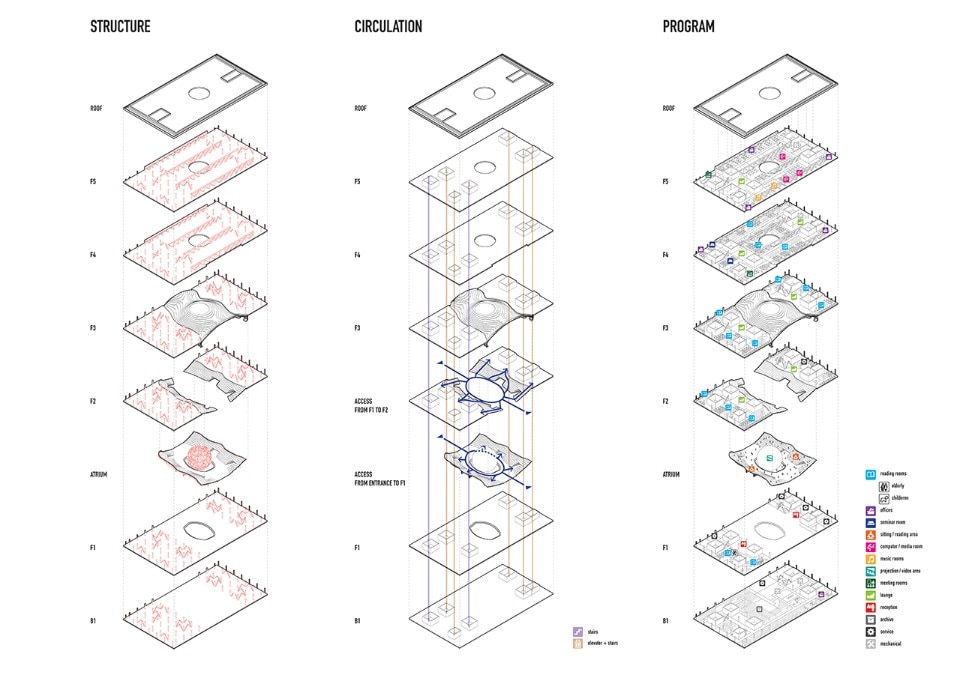 I cinque livelli dell’edificio contengono un vasto e articolato programma di servizi all’educazione. Il piano interrato ospita spazi di servizio e per l’archiviazione di documenti. Dal piano terra si accede alle varie aree di lettura per bambini e adulti, all’auditorium e ai terrazzamento dei livelli superiori. Al primo e secondo piano si trovano principalmente sale lettura, libri e aree lounge, mentre i successivi due livelli ospitano uffici, sale riunioni, aule computer e per la riproduzione di video e audio.