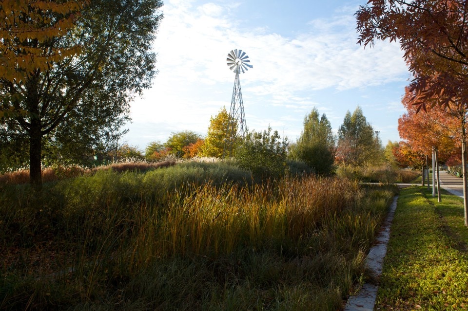 Il parco contiene infatti oltre a un’ampia zona di gioco con getti d’acqua, quattro grandi stagni o biotopi e un sistema di zone umide in cui l’acqua di pioggia viene raccolta e depurata, per poi essere immagazzinata in un serbatoio sotterraneo ed essere riutilizzata (attraverso una pompa alimentata da energia eolica) per l’irrigazione e per alimentare le stesse zone umide nei periodi secchi. In questo modo, la quantità d’acqua di pioggia sulle superfici pubbliche che finisce in fogna è dimezzata, mentre quasi la metà dell’irrigazione del parco è realizzata con acqua piovana. Dal punto di vista energetico, le scelte sono altrettanto lungimiranti. La città ha deciso di anticipare qui quelli che diventeranno standard nazionali nel 2020: emissioni zero (in fase d’esercizio).