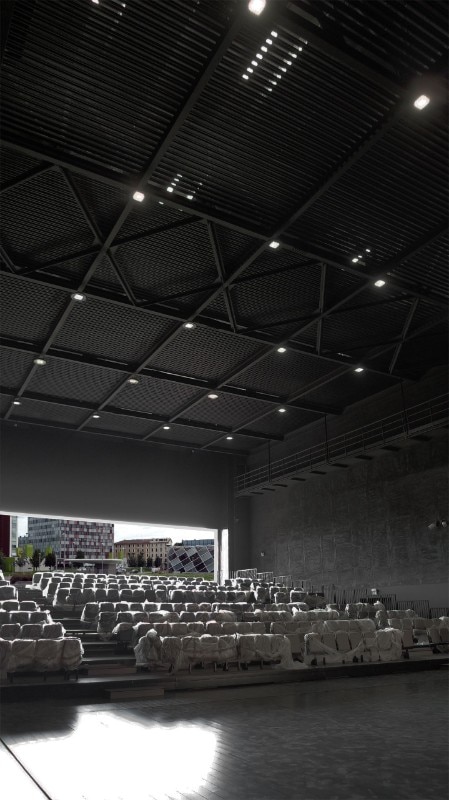 Mediante un portellone scorrevole tipo hangar aeronautico, il teatro si apre infatti completamente verso la platea naturale esterna a verde del parco antistante, permettendo la realizzazione di spettacoli outdoor per un pubblico di circa 2.000 persone, mica male. In attesa, ci si può consolare con gli oltre 300 posti del teatro coperto, un gioiello sobrio e minimalista di tonalità grigie con un grande e dominante palcoscenico che permetterà spettacoli anche importanti. Ma il palco è solo la ciliegina di un progetto che puntava a creare un’architettura “immersiva e fluida”, disponibile a ulteriori innesti e interventi se necessario, sottolinea l’architetto milanese, anche lui affascinato dal mondo dell’infanzia grazie ai suoi figli: “L’idea nasce dalla struttura-base dei videogiochi: ormai i bambini hanno interiorizzato il modo di muoversi all'interno dei videogame, trovandosi a proprio agio nella quarta dimensione che sottende il tempo necessario per lo spostamento e consente di strutturare le relazioni senza più la necessità del movimento”.
